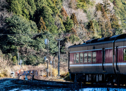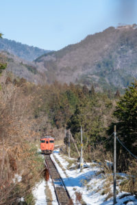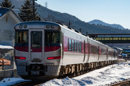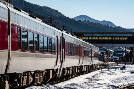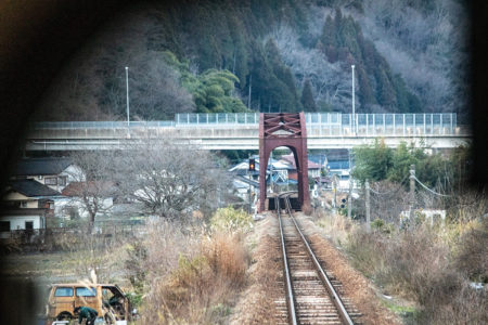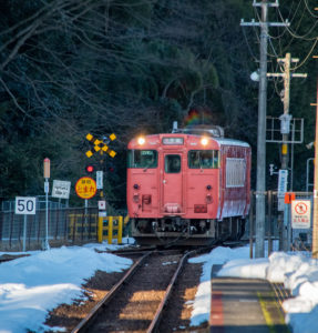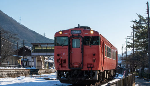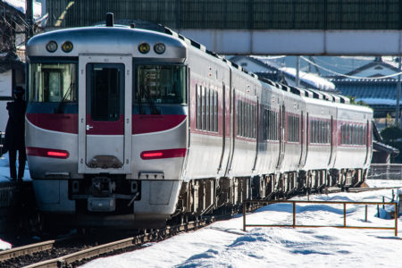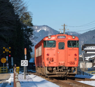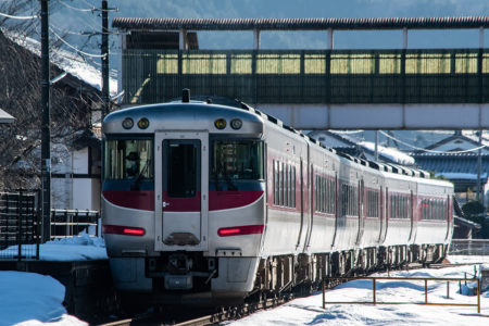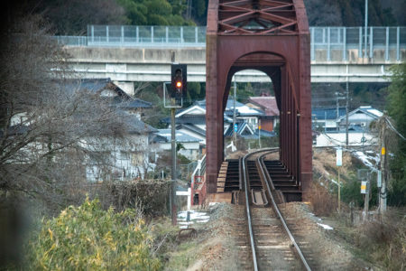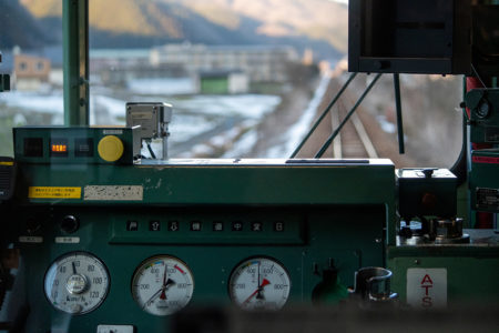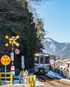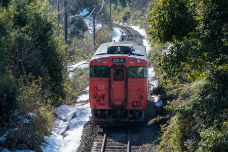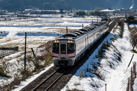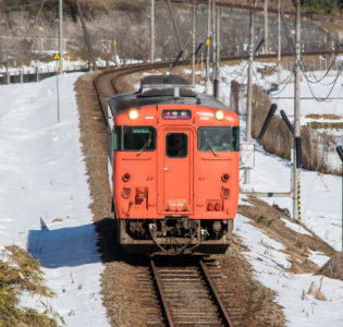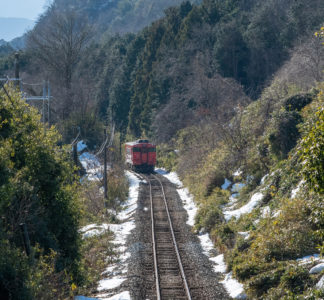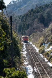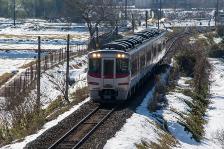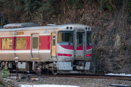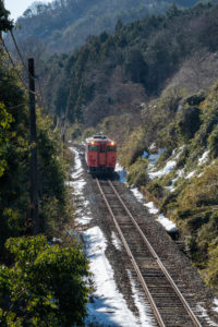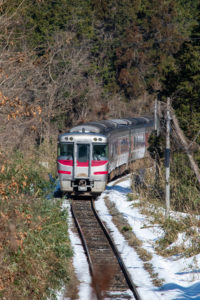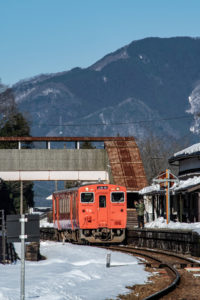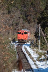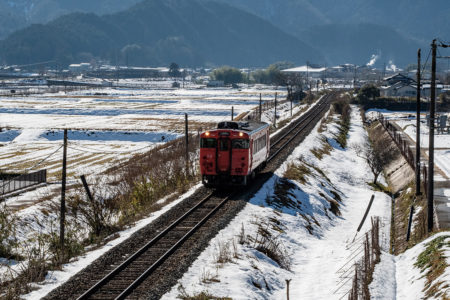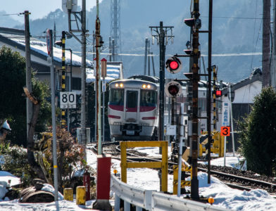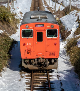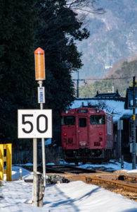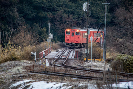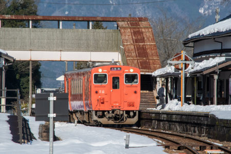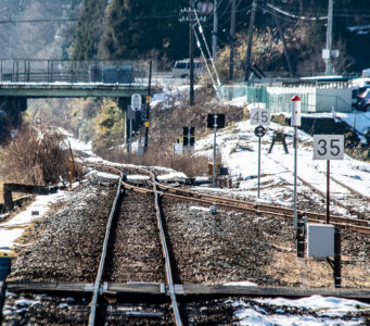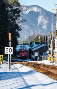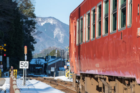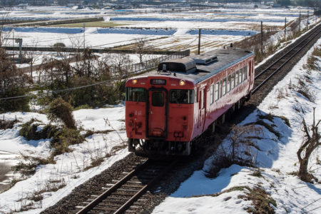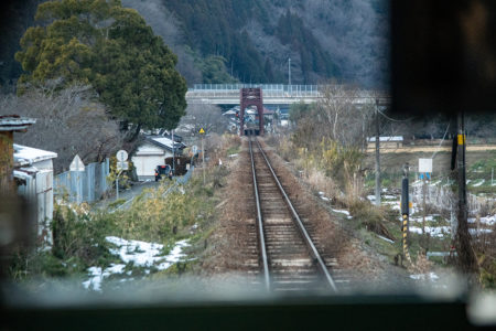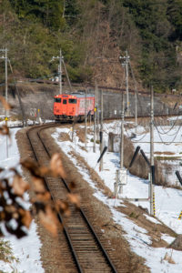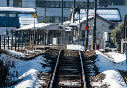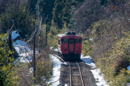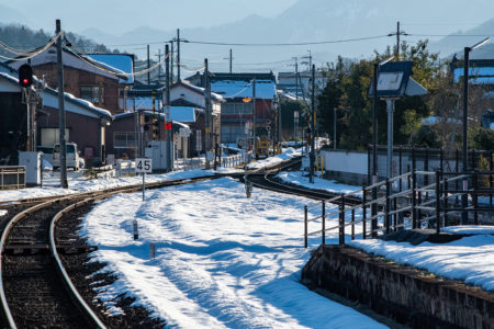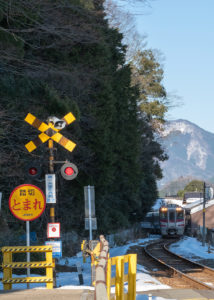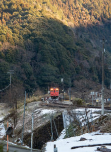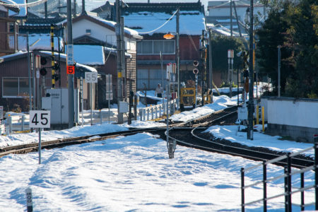 多少の雪を期待したが、2日前に降ったきりなので残雪状態だった。改めてみた長谷の俯瞰は、なるほどジオラマのように線路が見えて面白いところだったが、雪が中途半端で、中途半端にいろいろな物が写って地形や線路の面白さをいまひとつ際立たせられない。