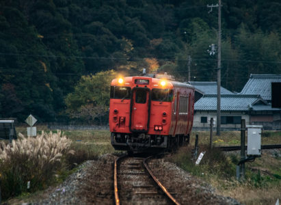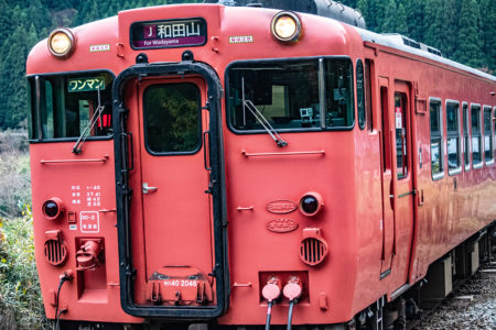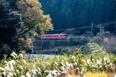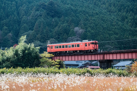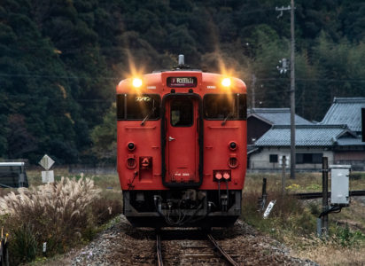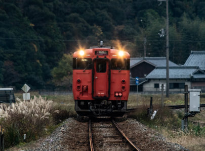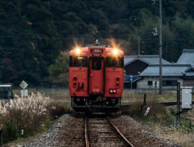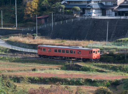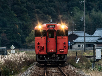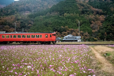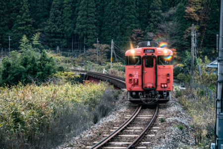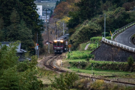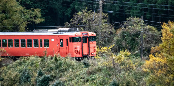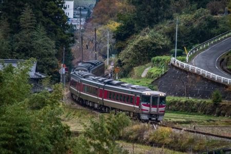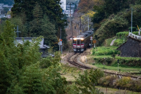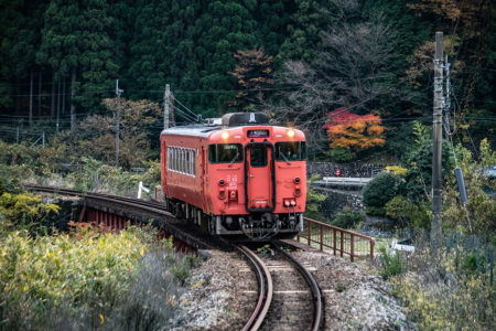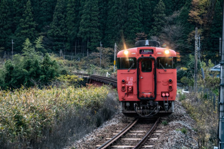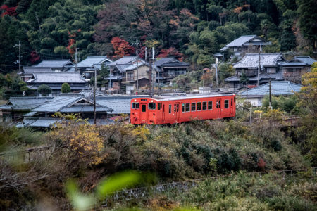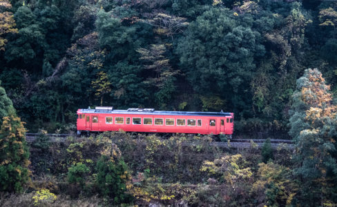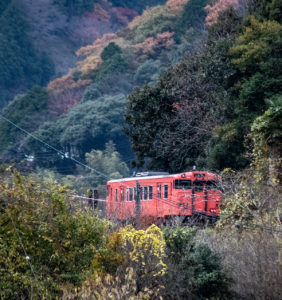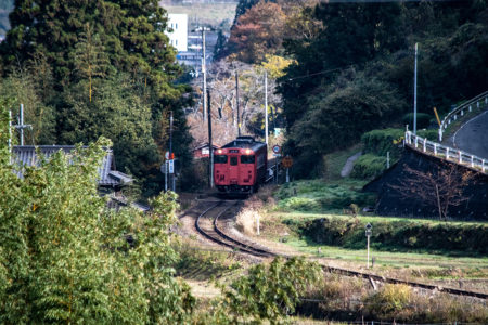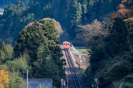 しかし、黒ベースのラッピングキハ40は、紅葉の風景に溶けてしまってまったく映えない。ラッピングは、風景とのマッチングを考えるべきだ。