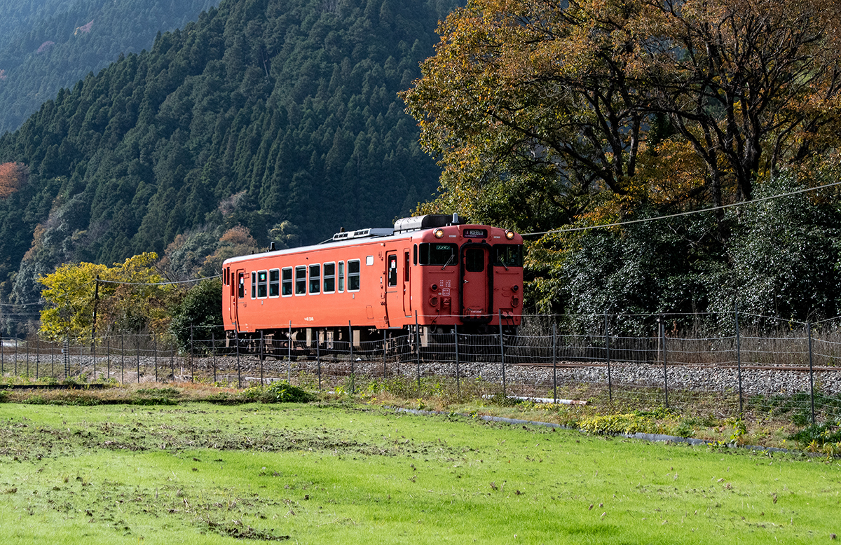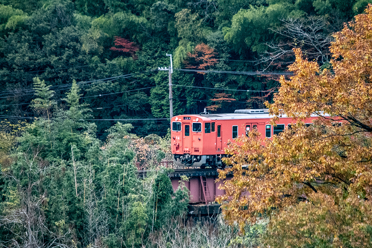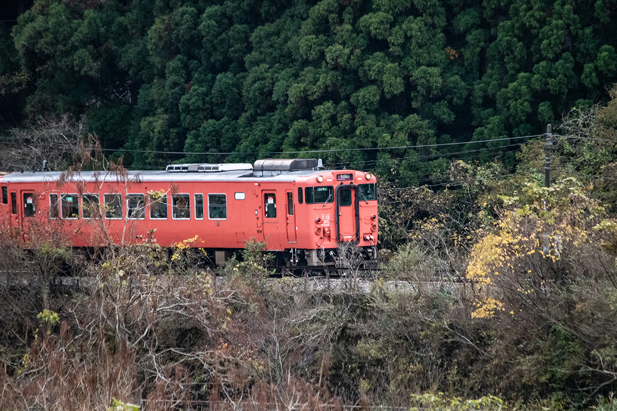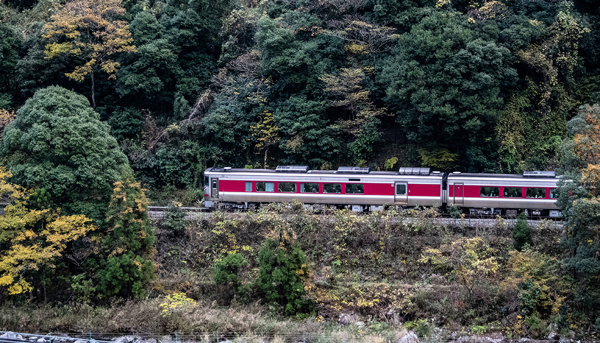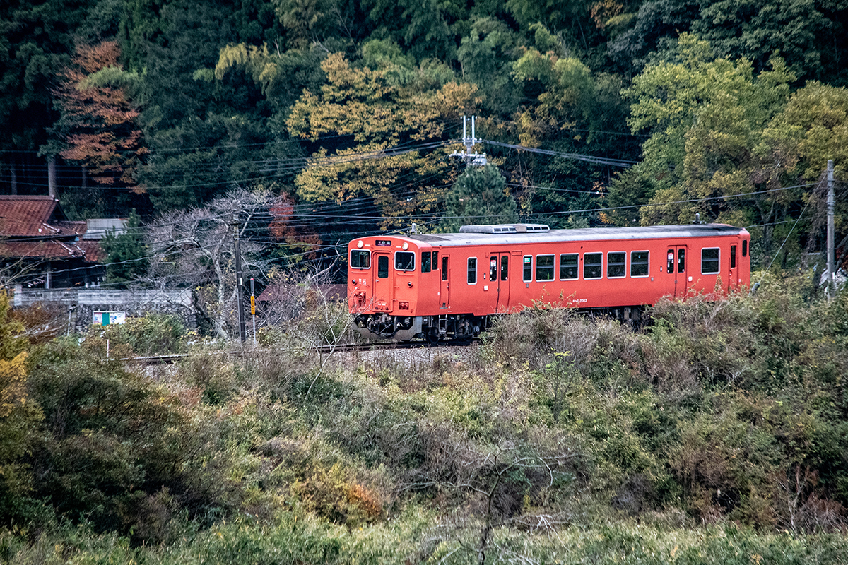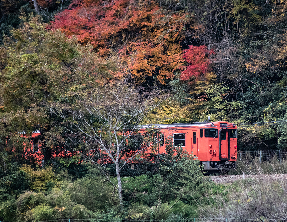 しかし、黒ベースのラッピングキハ40は、紅葉の風景に溶けてしまってまったく映えない。ラッピングは、風景とのマッチングを考えるべきだ。
