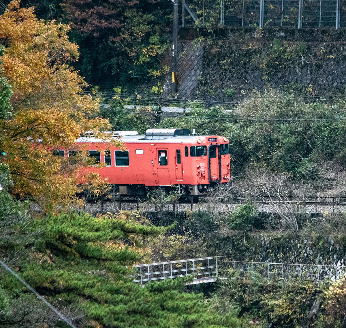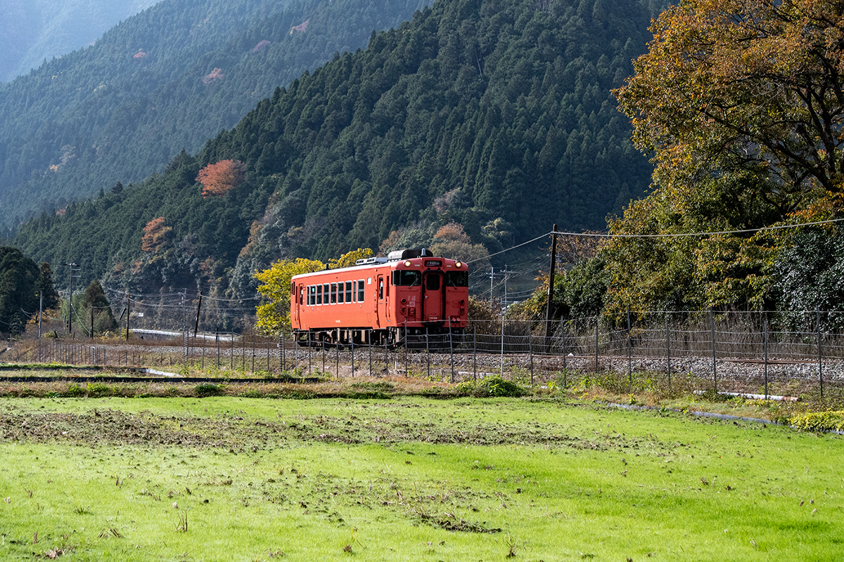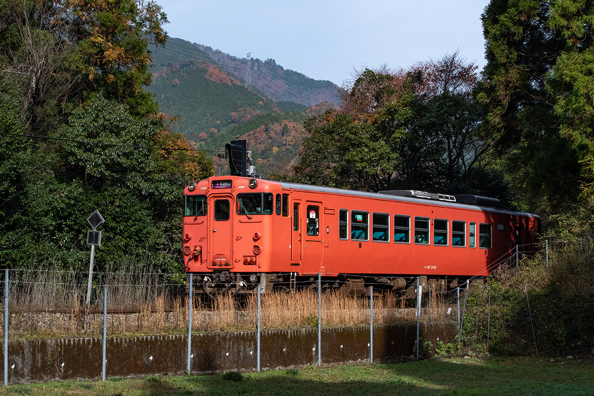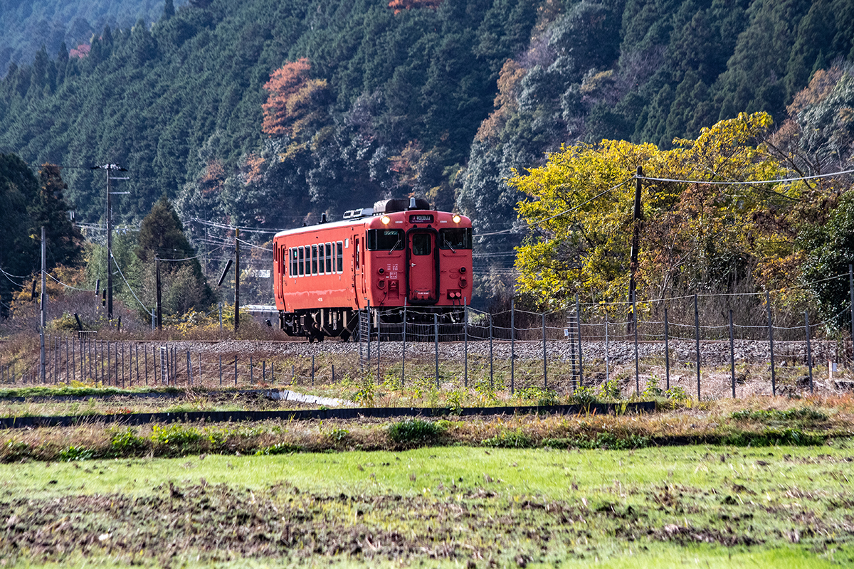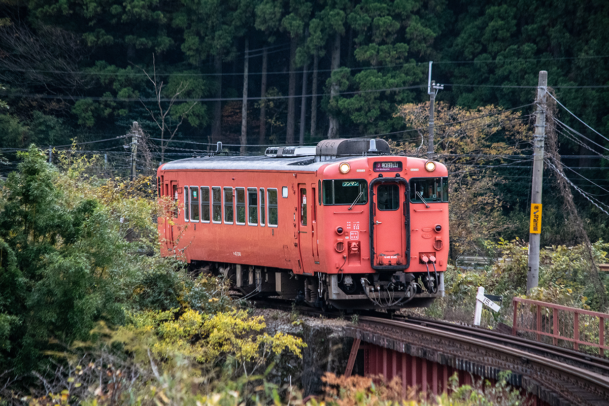 しかし、黒ベースのラッピングキハ40は、紅葉の風景に溶けてしまってまったく映えない。ラッピングは、風景とのマッチングを考えるべきだ。