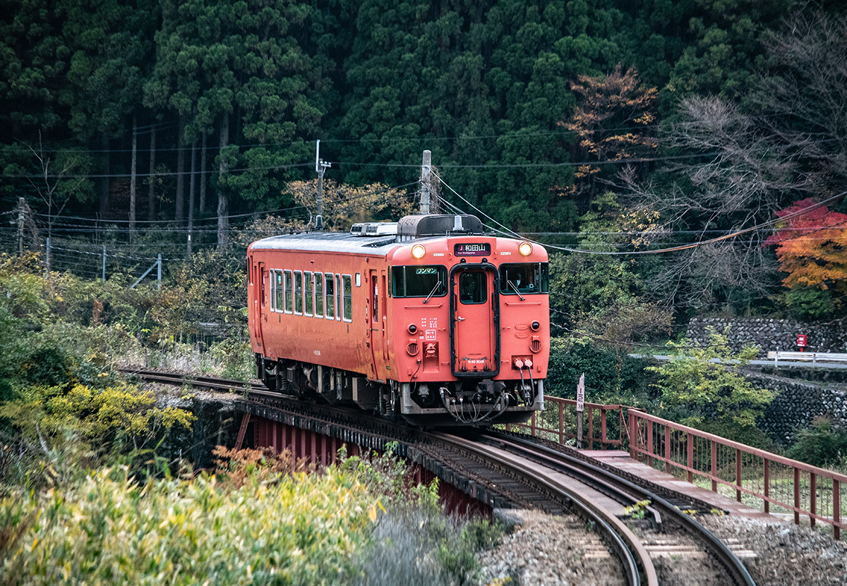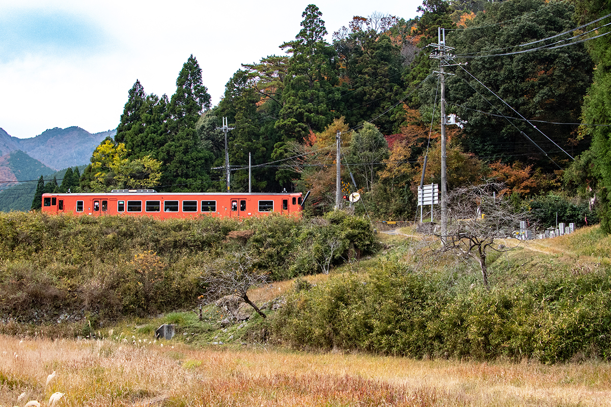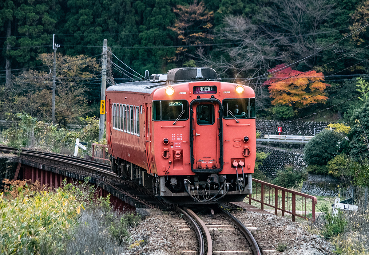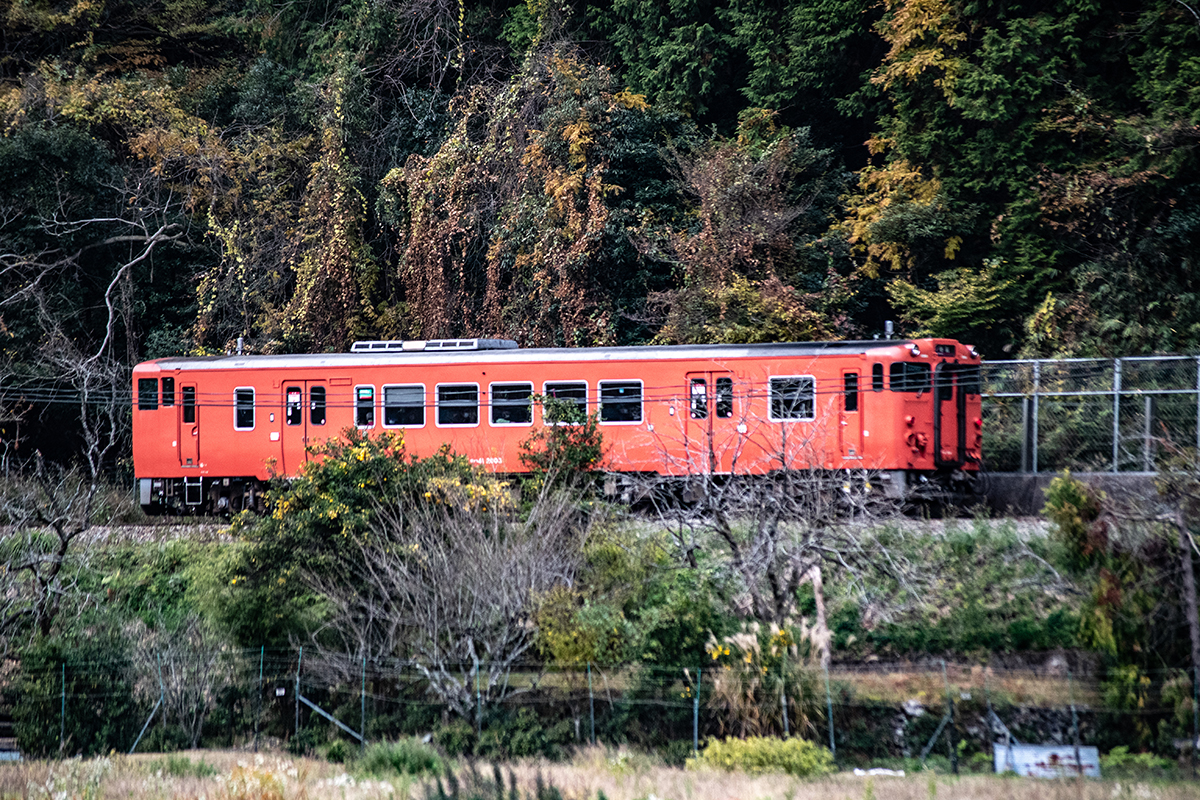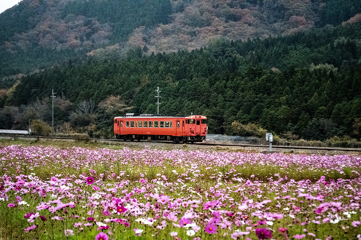 しかし、黒ベースのラッピングキハ40は、紅葉の風景に溶けてしまってまったく映えない。ラッピングは、風景とのマッチングを考えるべきだ。