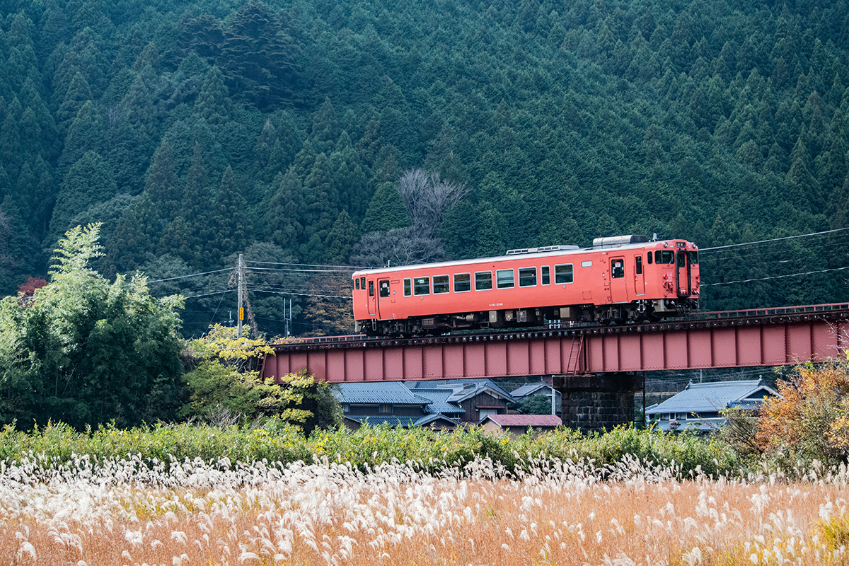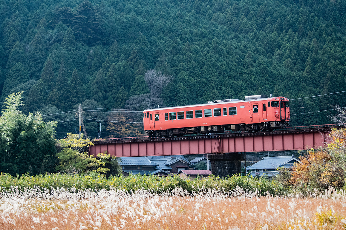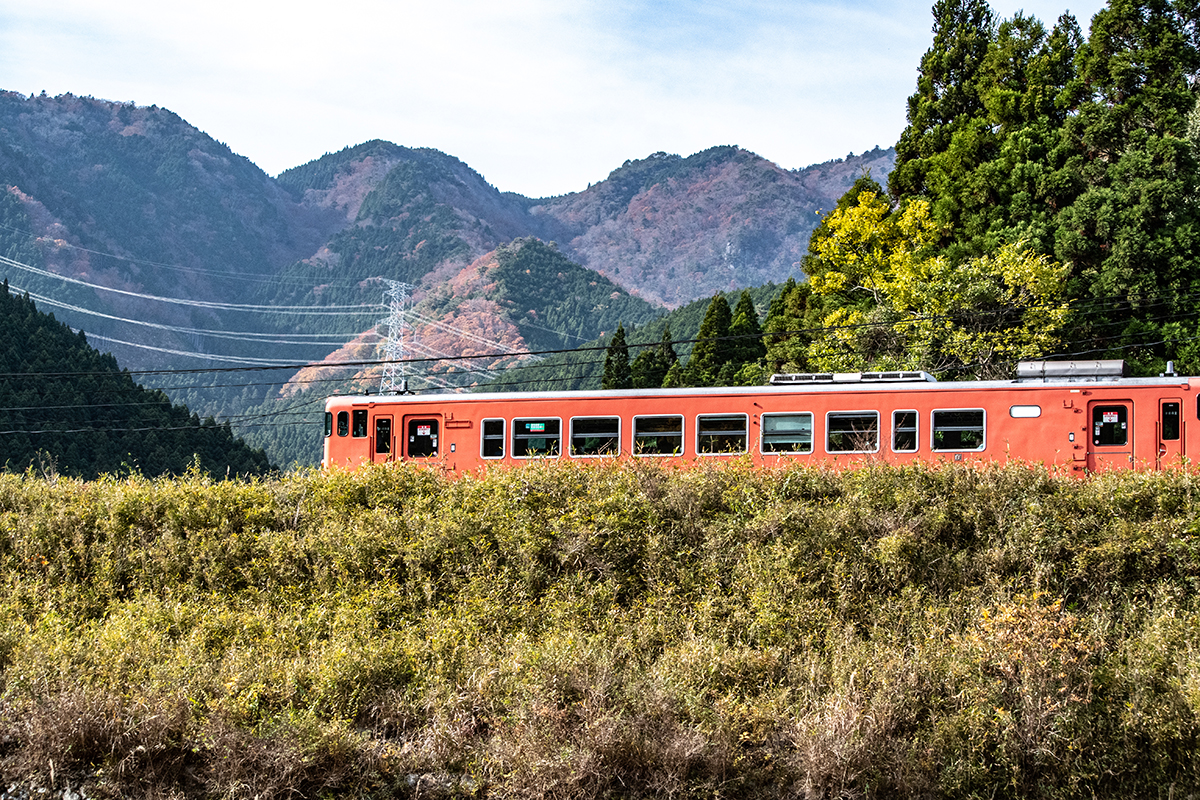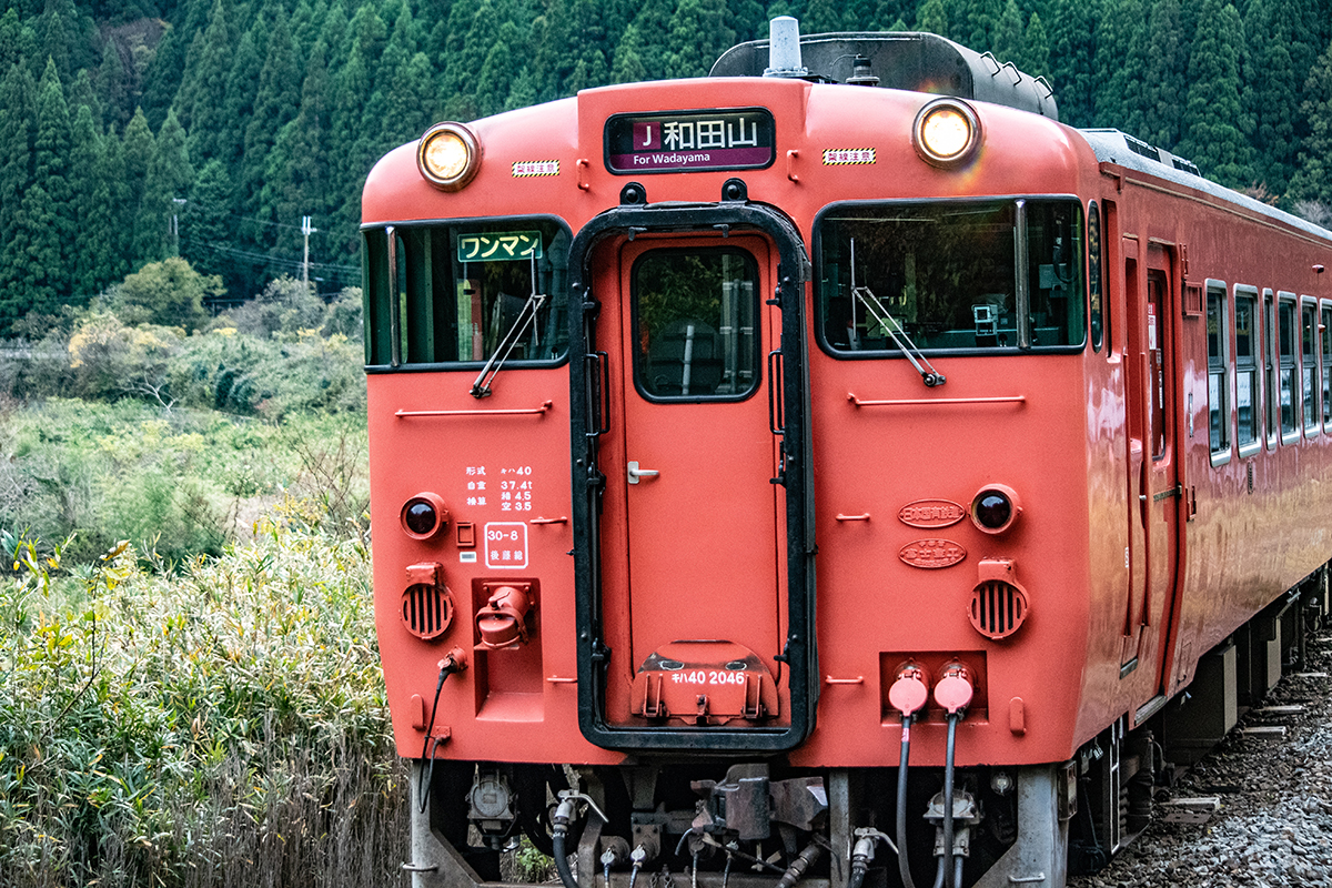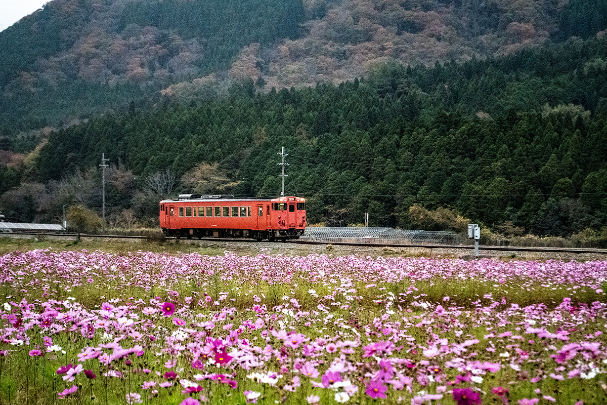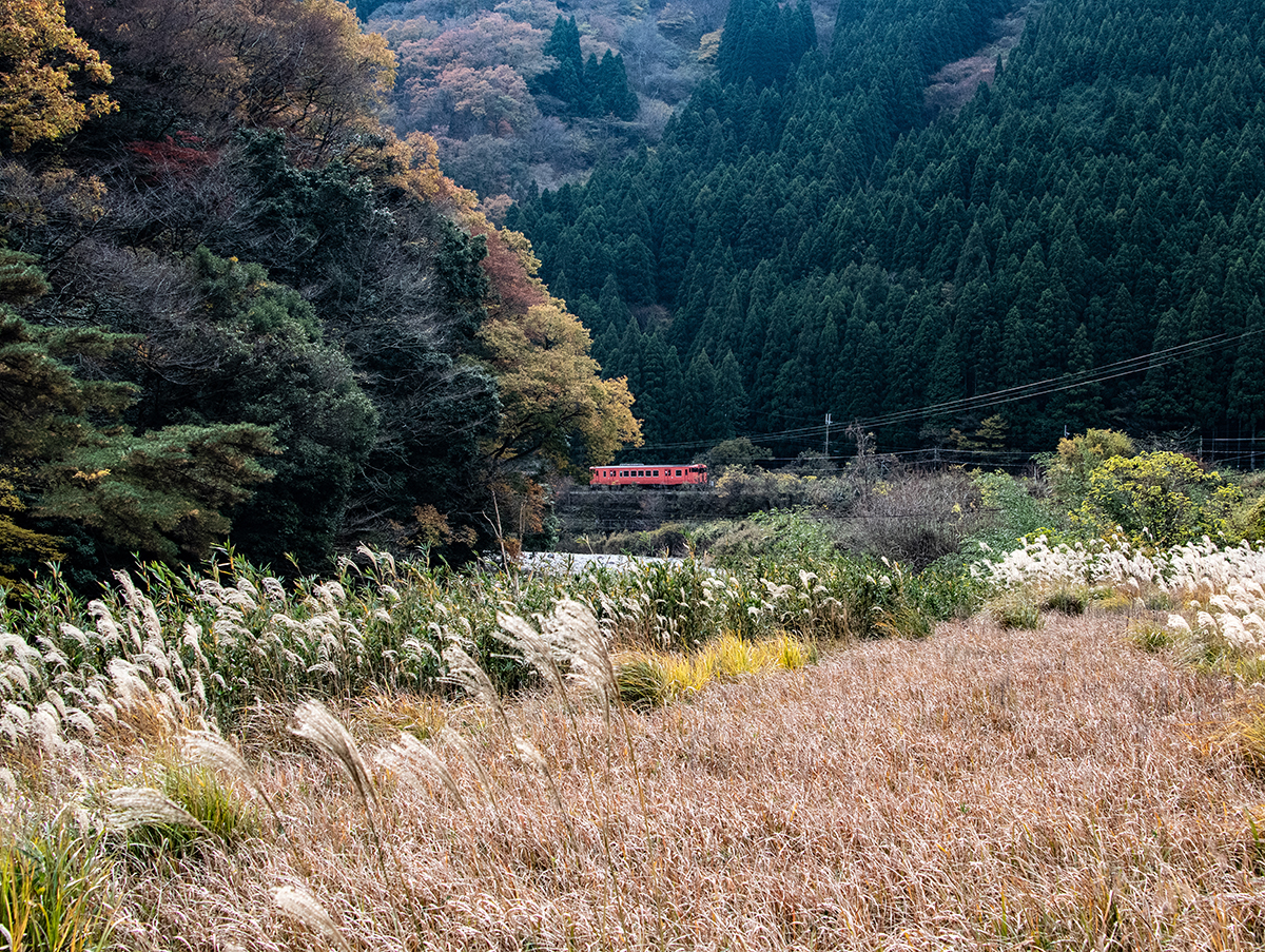 しかし、黒ベースのラッピングキハ40は、紅葉の風景に溶けてしまってまったく映えない。ラッピングは、風景とのマッチングを考えるべきだ。