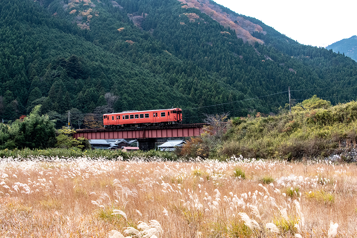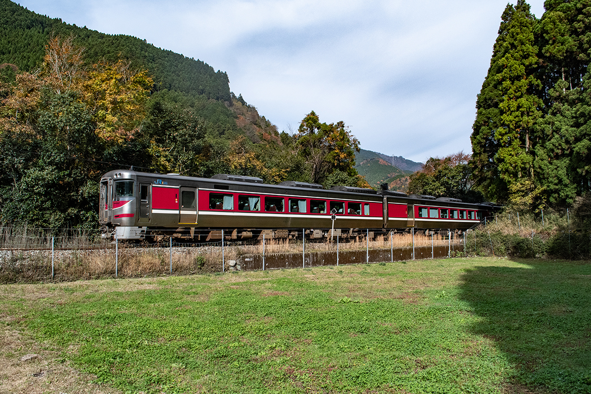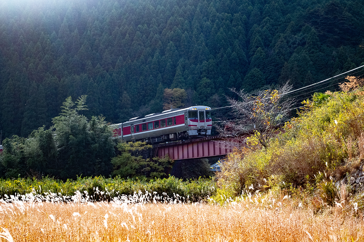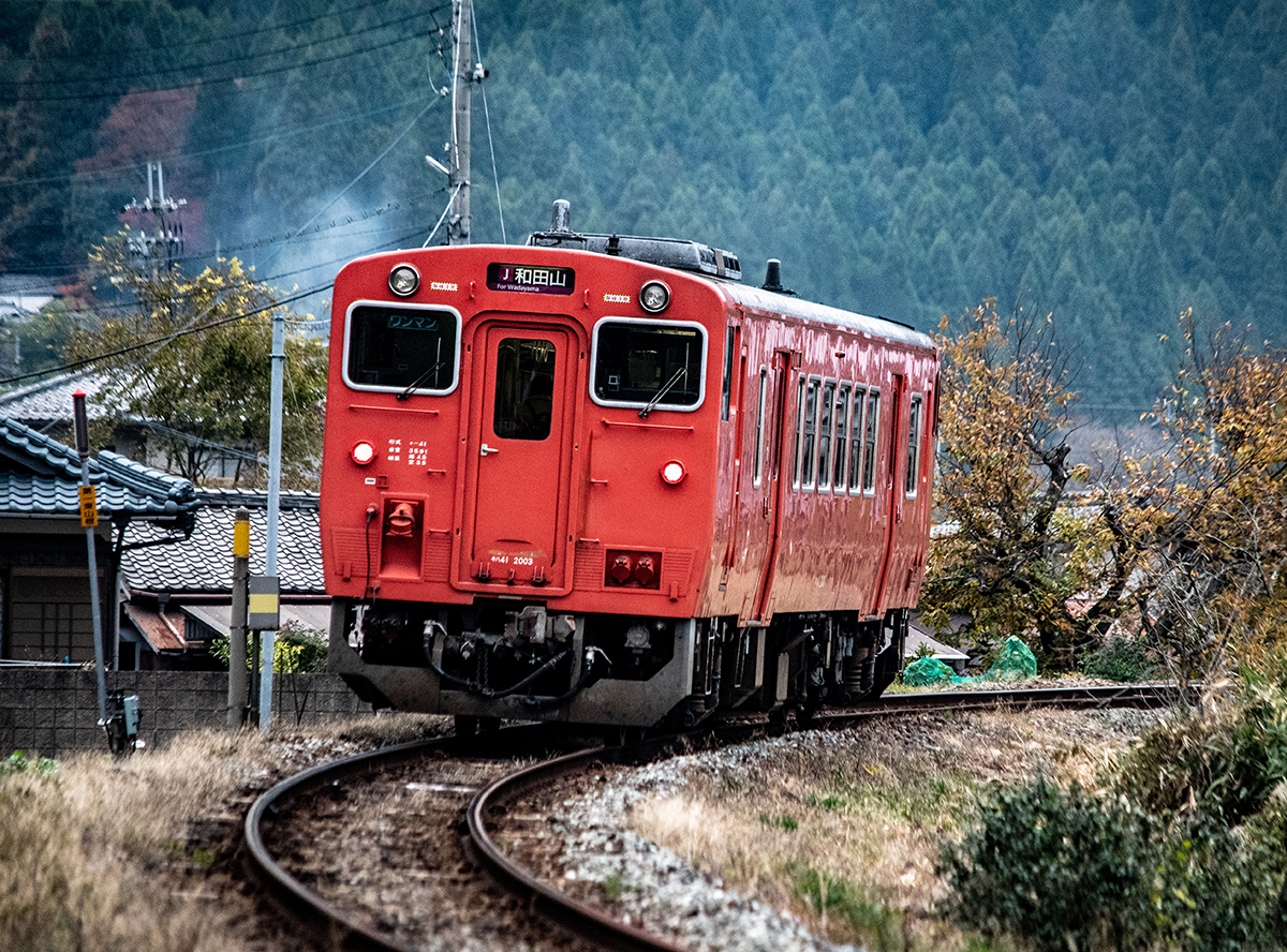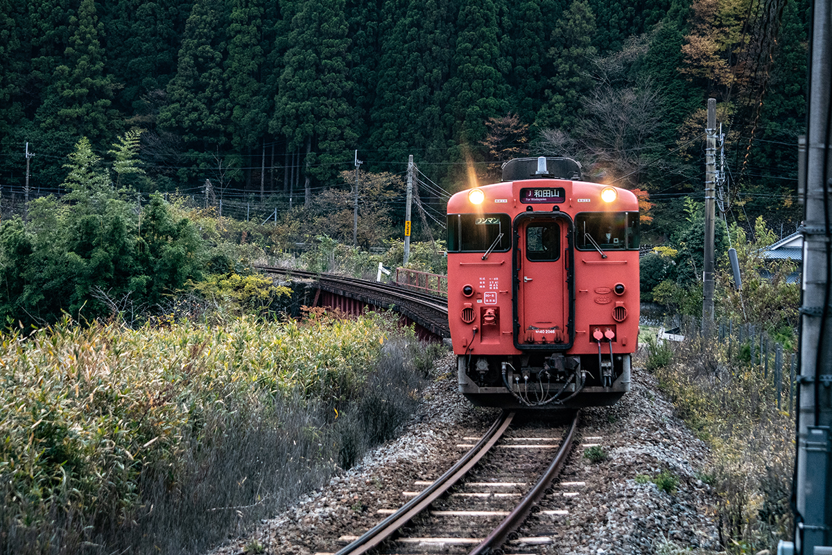 しかし、黒ベースのラッピングキハ40は、紅葉の風景に溶けてしまってまったく映えない。ラッピングは、風景とのマッチングを考えるべきだ。
