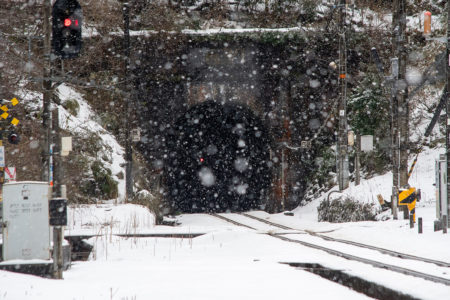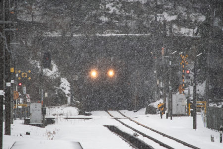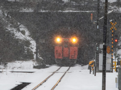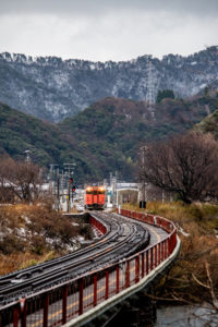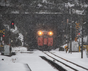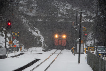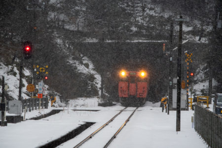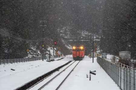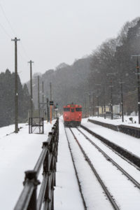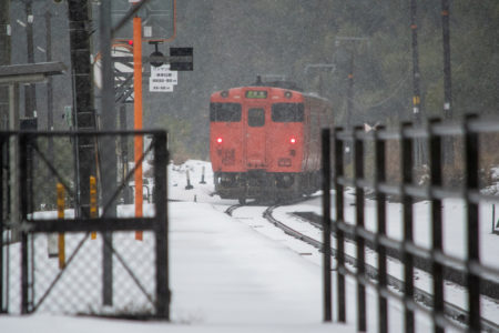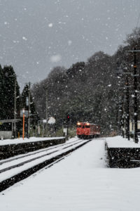 15分後には列車が来るので、急いで用意をしなければならないが、この雪で果たして写るのだろうか。それに、いつも写真を撮る傍らで動画を撮っているが、一眼レフとiPhone、それと音声は別にレコーダーで録る。この雪でセッティングできるのか。と、考えている時間はなく、こういうときのためにAmazonでかっておいたオレンジ色のポンチョを着てみる。大きなイカのようなカタチで全身を覆ってくれるのだが、これが大正解で、手持ちのカメラもダイヤや小物を入れているショルダーバッグも完全に雪から守られる。さらに、他のバッグのレインカバーをカメラ用に持ってきたのも大活躍。すべての機材をスタンバイして直前まで防雪できた。