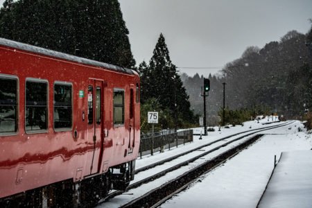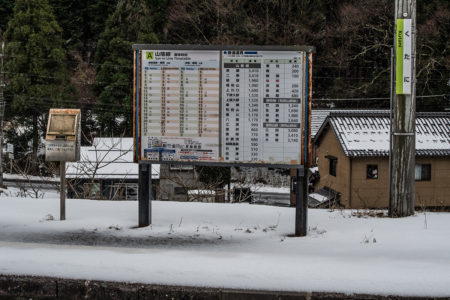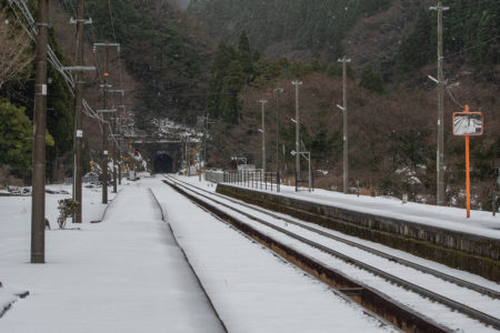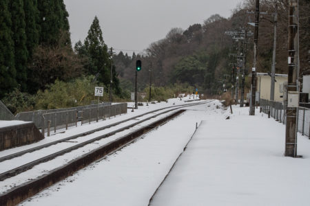 山あいのぽつんとひと駅。集落から離れて、たたずむ真っ白に雪が積もったその駅は、ホーム上には、駅名表示と時刻表しかなく、待合室さえない停車場。タヌキやキツネしか乗降客はいないのではないかと思えるくらい世間から隔離された空間にしんしんと雪がふっておりました。一面が雪なので、先に抜ける道があるのかどうかも分からない。かろうじで分かる道を進んで、入るのももったいないような真っ白な空間に車を止め、しばし周囲を観察。どこからどこが地面なのかも分からないほど雪が積もっている。