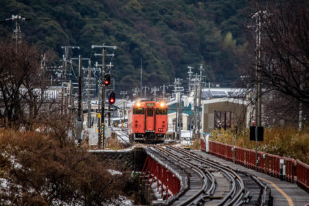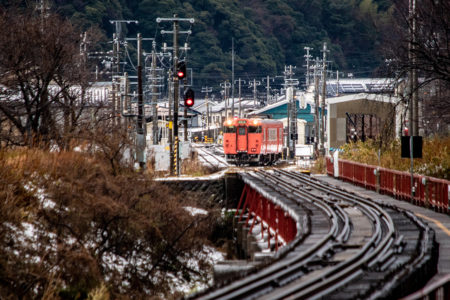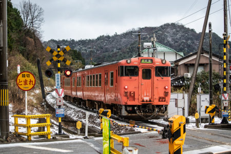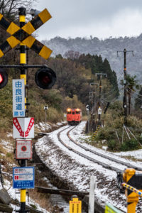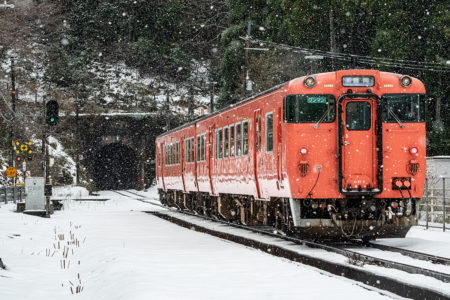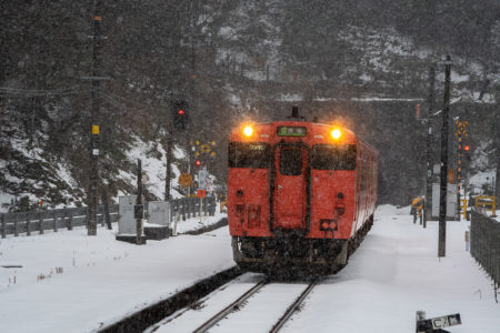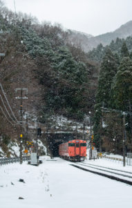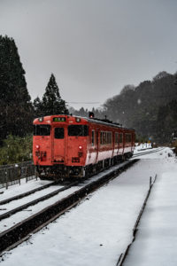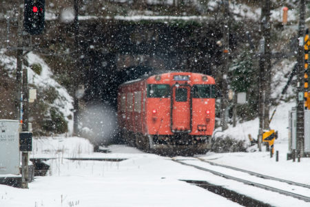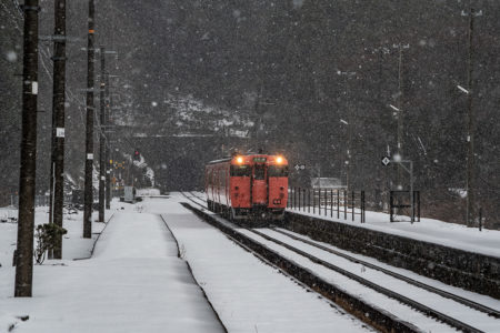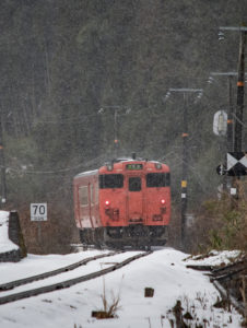 とにかく本日の一番の目的は、浜坂のひとつ手前の久谷という駅に行ってみたかったのだった。行ったことのない場所に撮影に行くときは、グルーグルマップ&アースで現地をパソコンで視察していくが、トンネルを抜けたところに踏切とポツンとプラットホームがある、山あいの静かな(と想像)いい感じなのだった。そこの雪景色とオレンジ色のキハ40を撮りたいと思ったのだ。