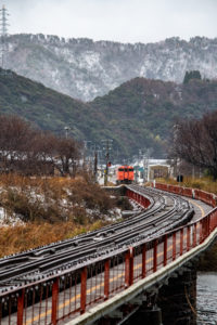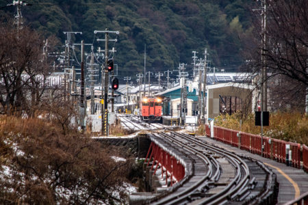その後香住に戻る途中で時間があったので餘部鉄橋に寄ってみたが、ここも残雪状態で鬼のような強風。お土産だけ買って香住へ。香住も強風で、下見しておいた鉄橋でなんとか2本撮って暗くならないうちに友人宅へ帰った。