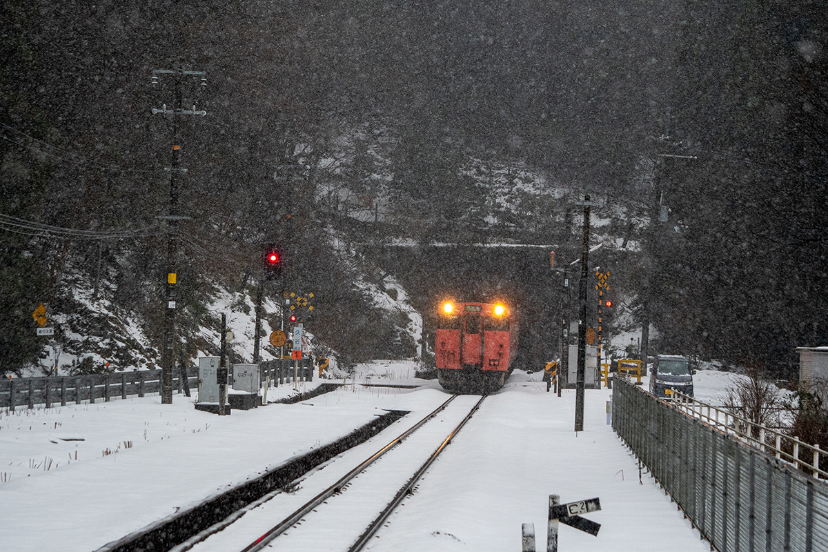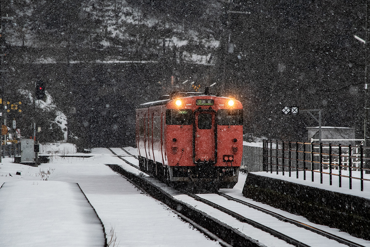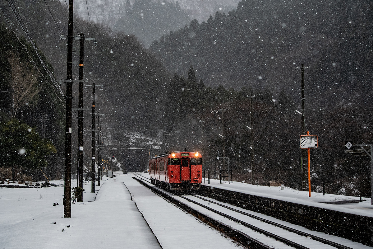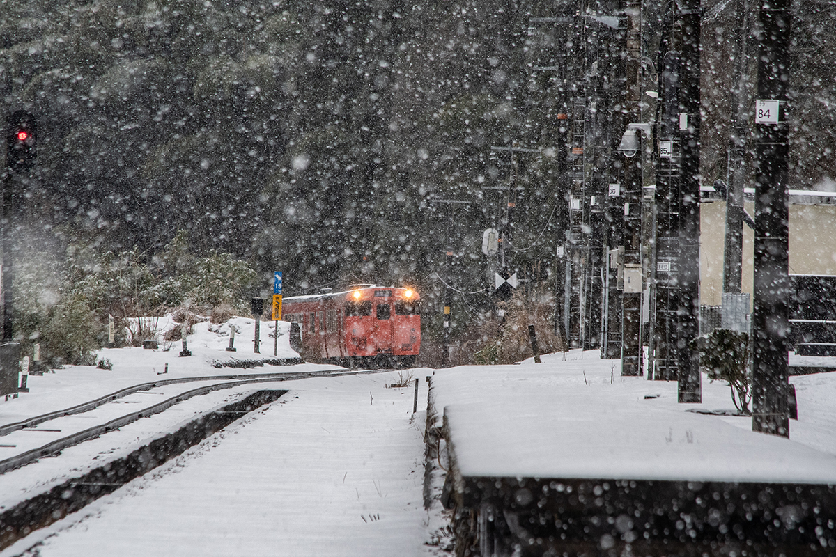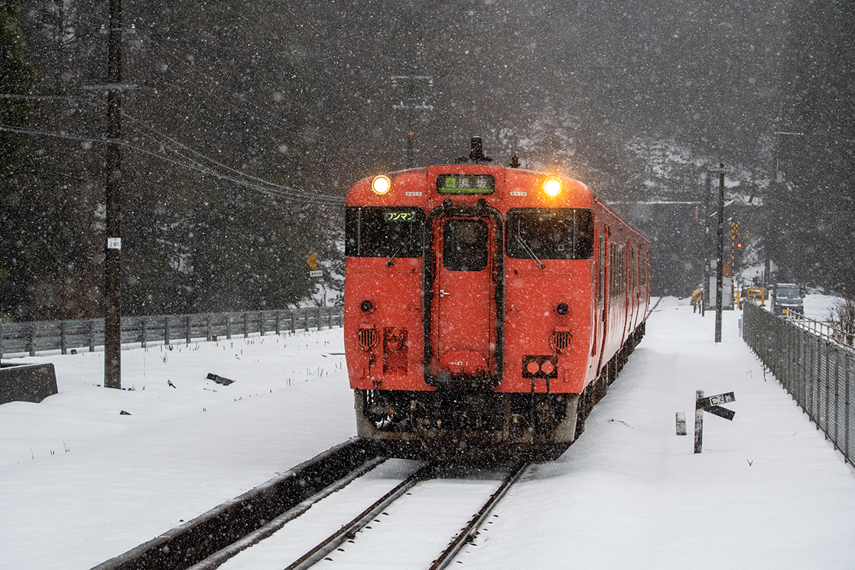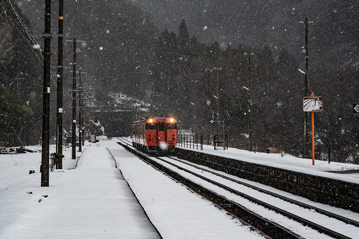 しかし、大晦日に山あいのポツンと一軒駅でこんなことをしているのは、普通の人から見ると変人に見えるのだろうなあと思いながら目的の3本を消化。特急はまかぜも来るはずだったが雪で運休。列車の運転士からは、大晦日に雪の中で写真を撮ってる頭のおかしいオレンジのイカにしか見えなかったかも(笑)