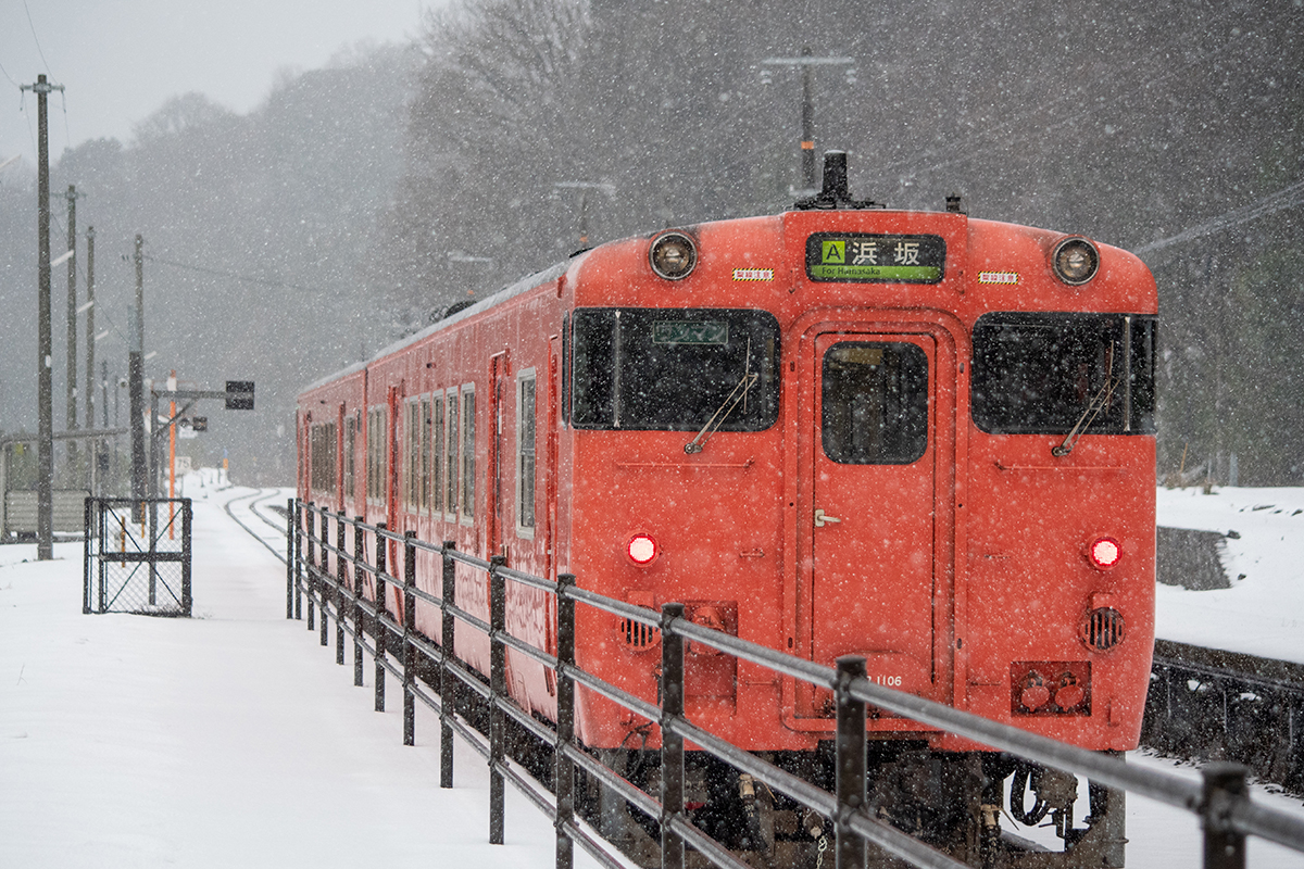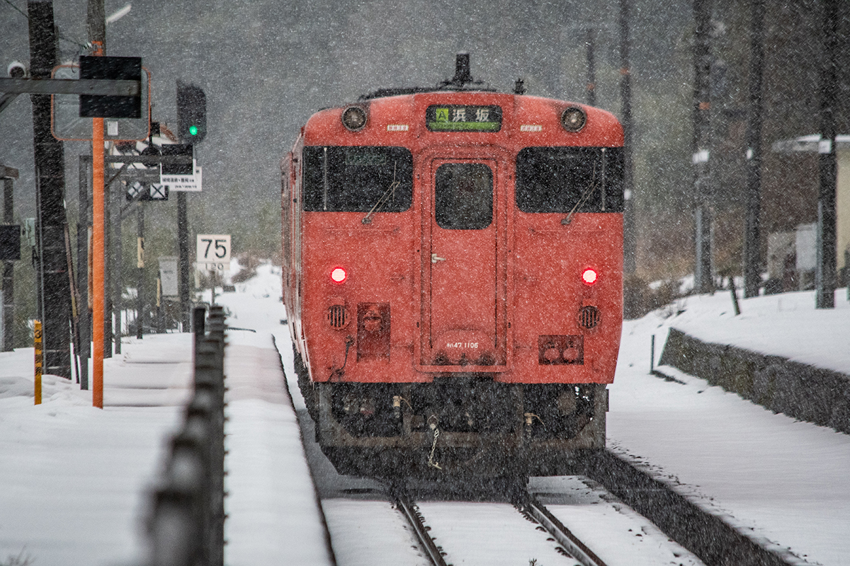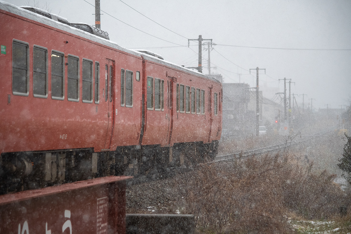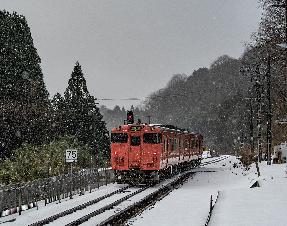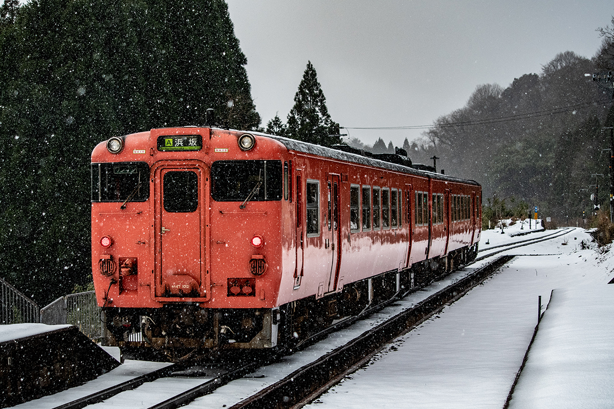 年末年始雪鉄ツアーの2日目に友人の車を借りて浜坂の手前まで行った。友人宅のある日高町は、朝から一面の雪景色。道路も山もこんもりと雪が積もって絶好の雪鉄日よりと思いきやまたもや「海沿いは雪ないかもよ」との話。なんでも香住の実家のある人の話では、昨日なかったと。