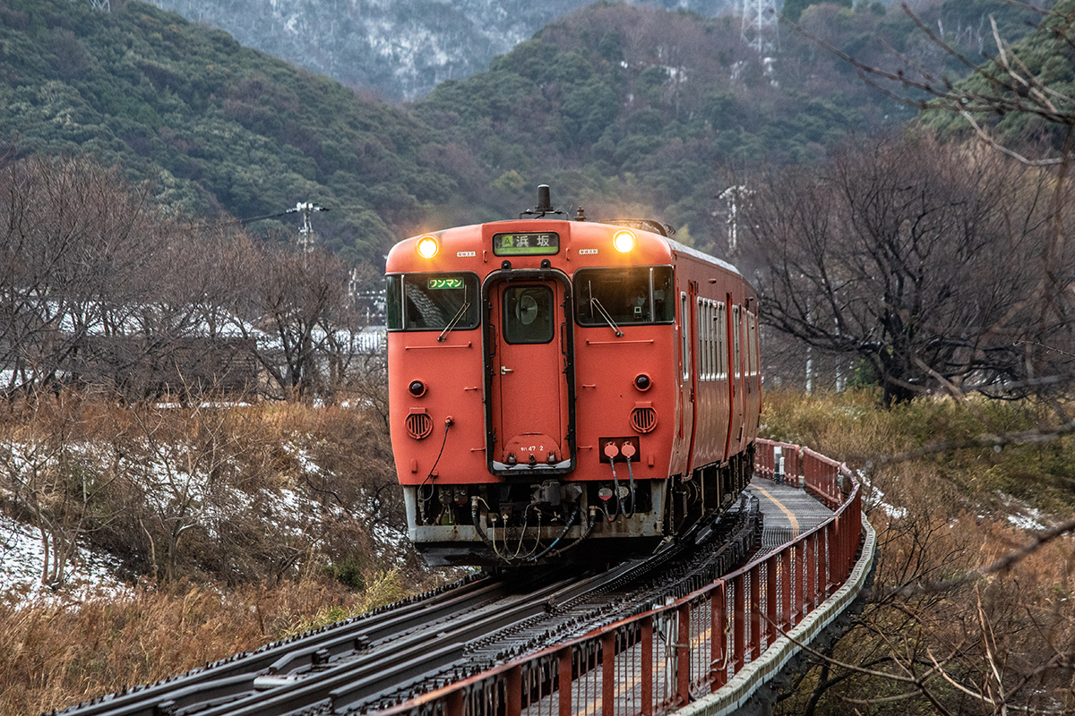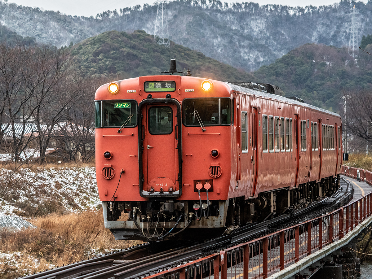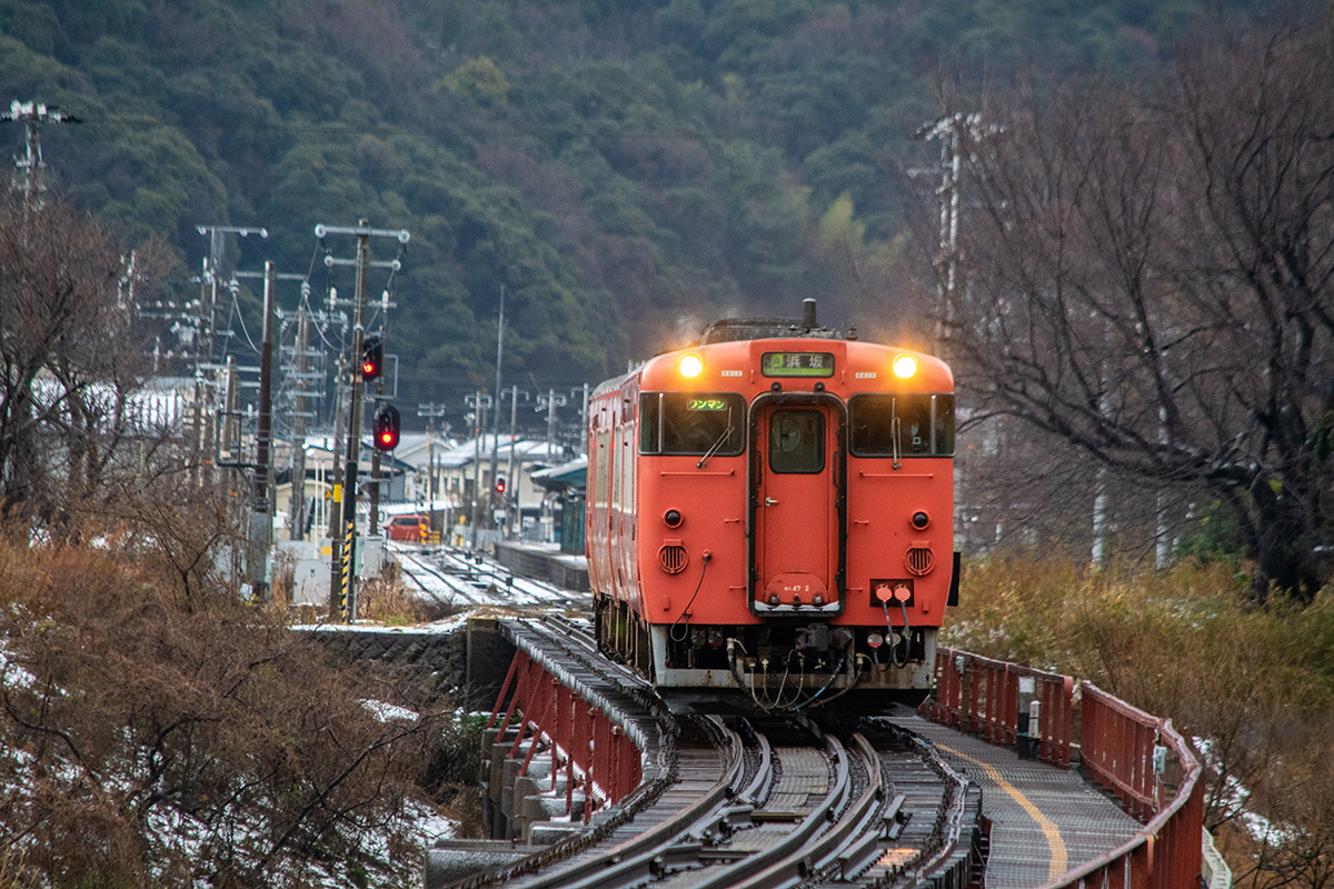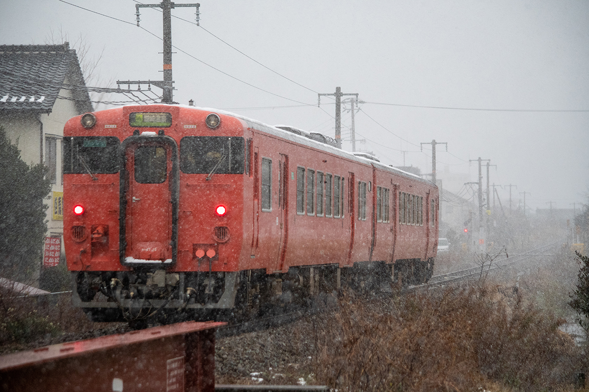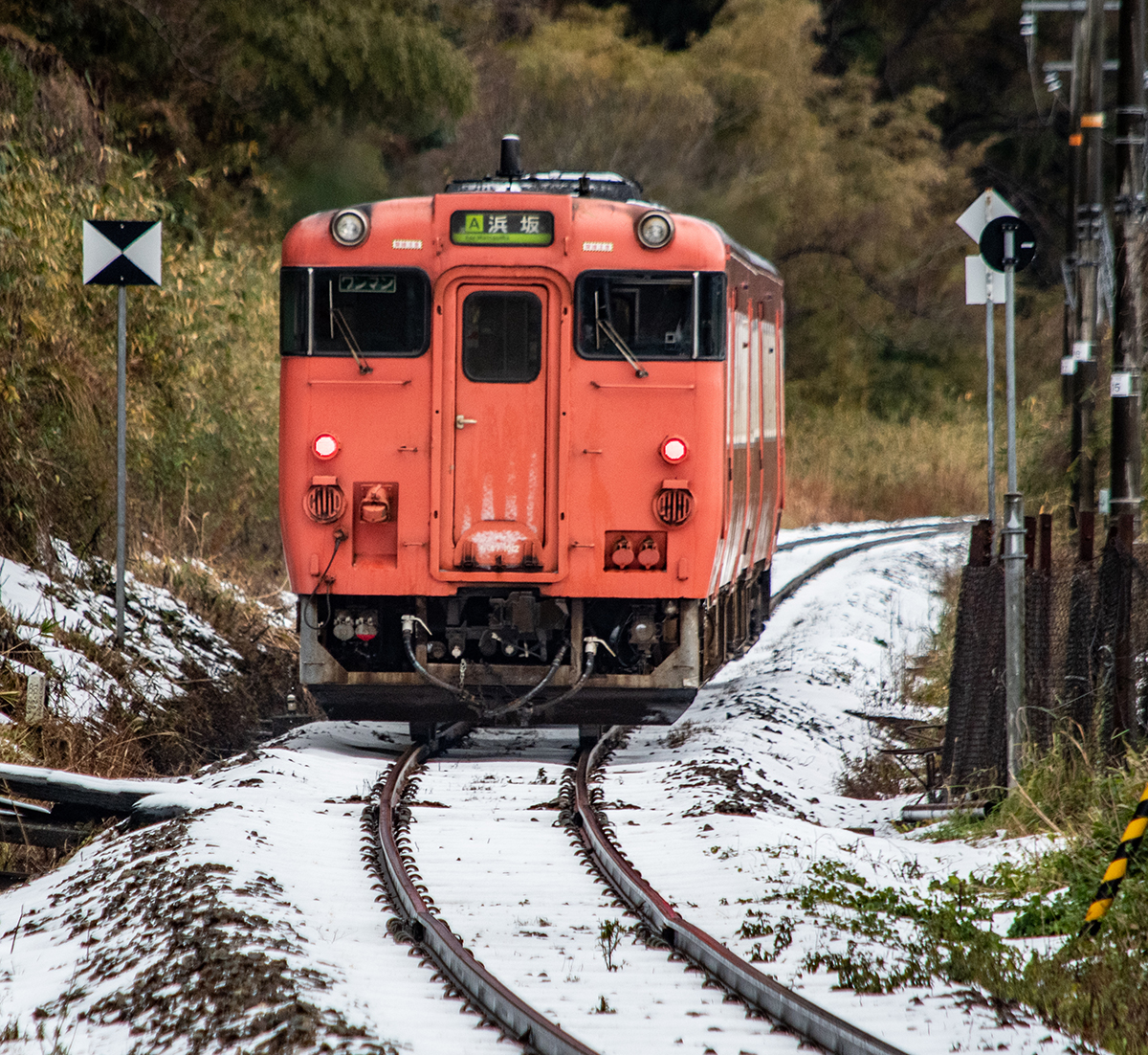 年末年始雪鉄ツアーの2日目に友人の車を借りて浜坂の手前まで行った。友人宅のある日高町は、朝から一面の雪景色。道路も山もこんもりと雪が積もって絶好の雪鉄日よりと思いきやまたもや「海沿いは雪ないかもよ」との話。なんでも香住の実家のある人の話では、昨日なかったと。