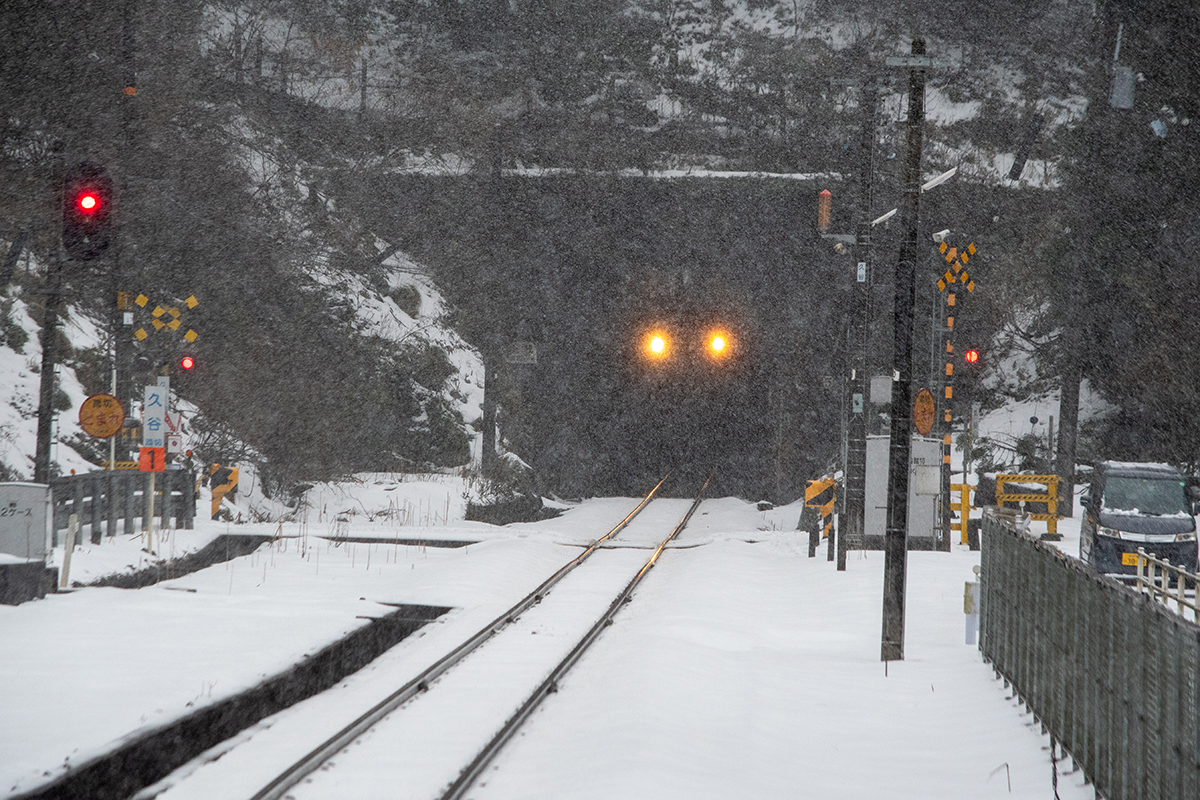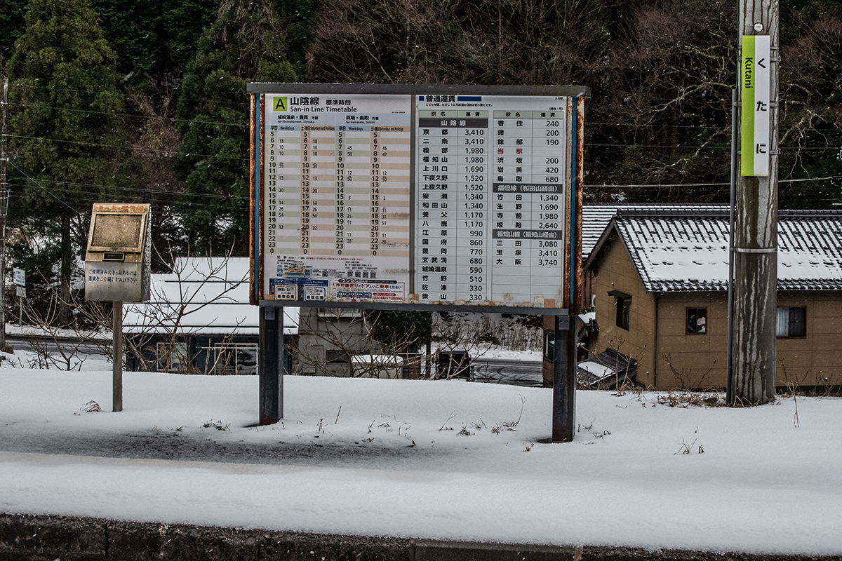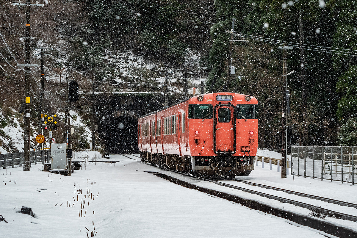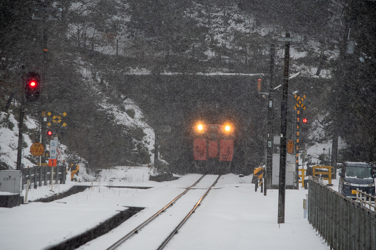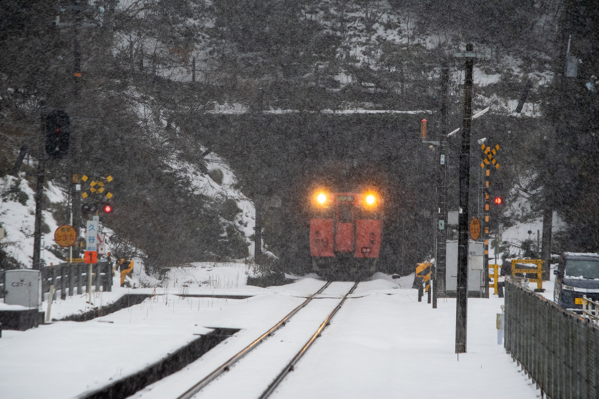 とにかく本日の一番の目的は、浜坂のひとつ手前の久谷という駅に行ってみたかったのだった。行ったことのない場所に撮影に行くときは、グルーグルマップ&アースで現地をパソコンで視察していくが、トンネルを抜けたところに踏切とポツンとプラットホームがある、山あいの静かな(と想像)いい感じなのだった。そこの雪景色とオレンジ色のキハ40を撮りたいと思ったのだ。