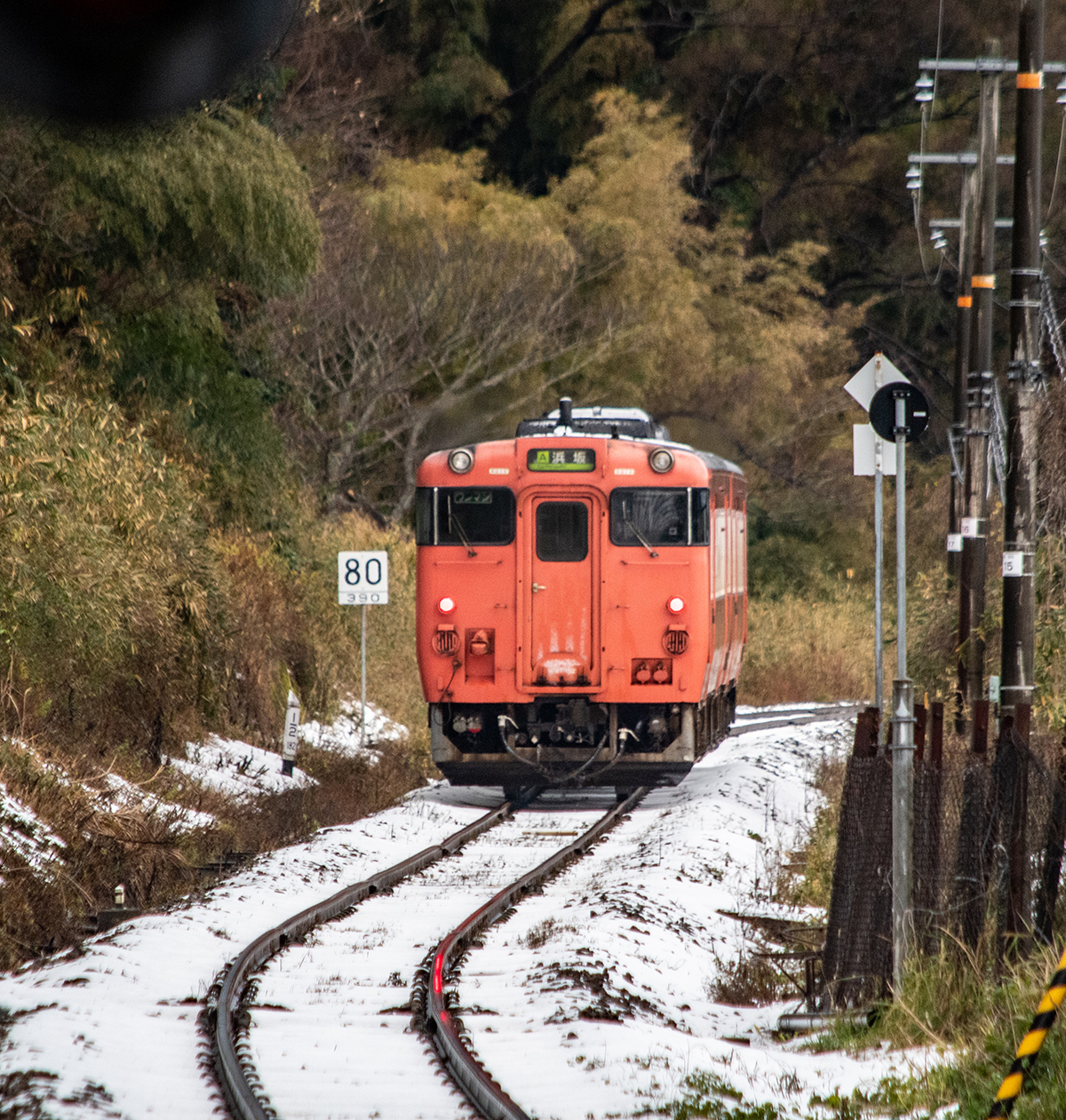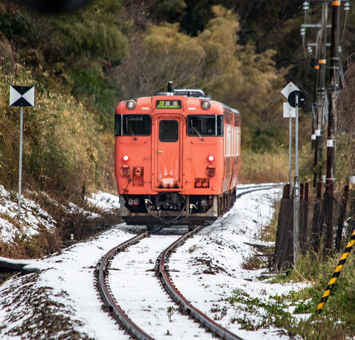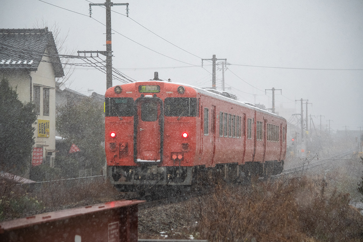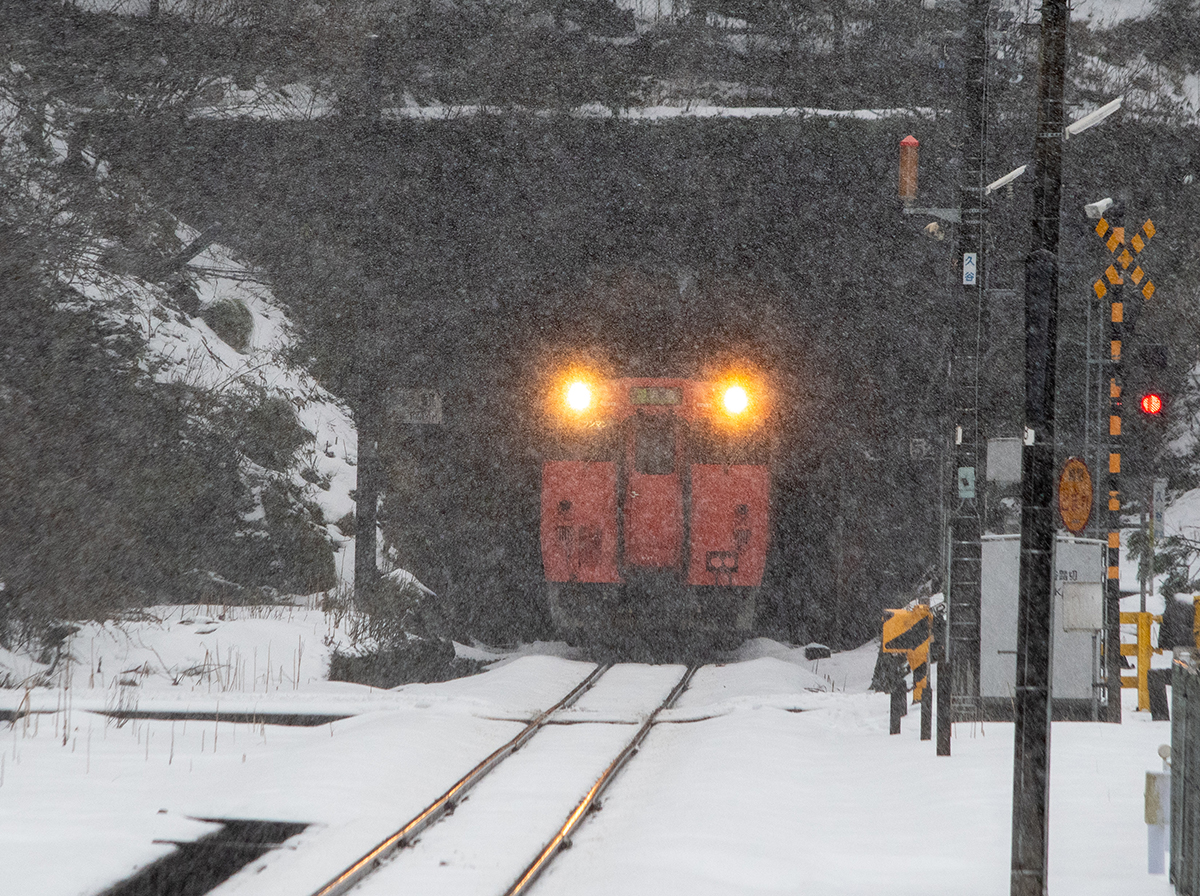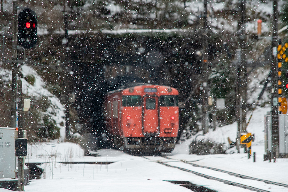 とにかく本日の一番の目的は、浜坂のひとつ手前の久谷という駅に行ってみたかったのだった。行ったことのない場所に撮影に行くときは、グルーグルマップ&アースで現地をパソコンで視察していくが、トンネルを抜けたところに踏切とポツンとプラットホームがある、山あいの静かな(と想像)いい感じなのだった。そこの雪景色とオレンジ色のキハ40を撮りたいと思ったのだ。