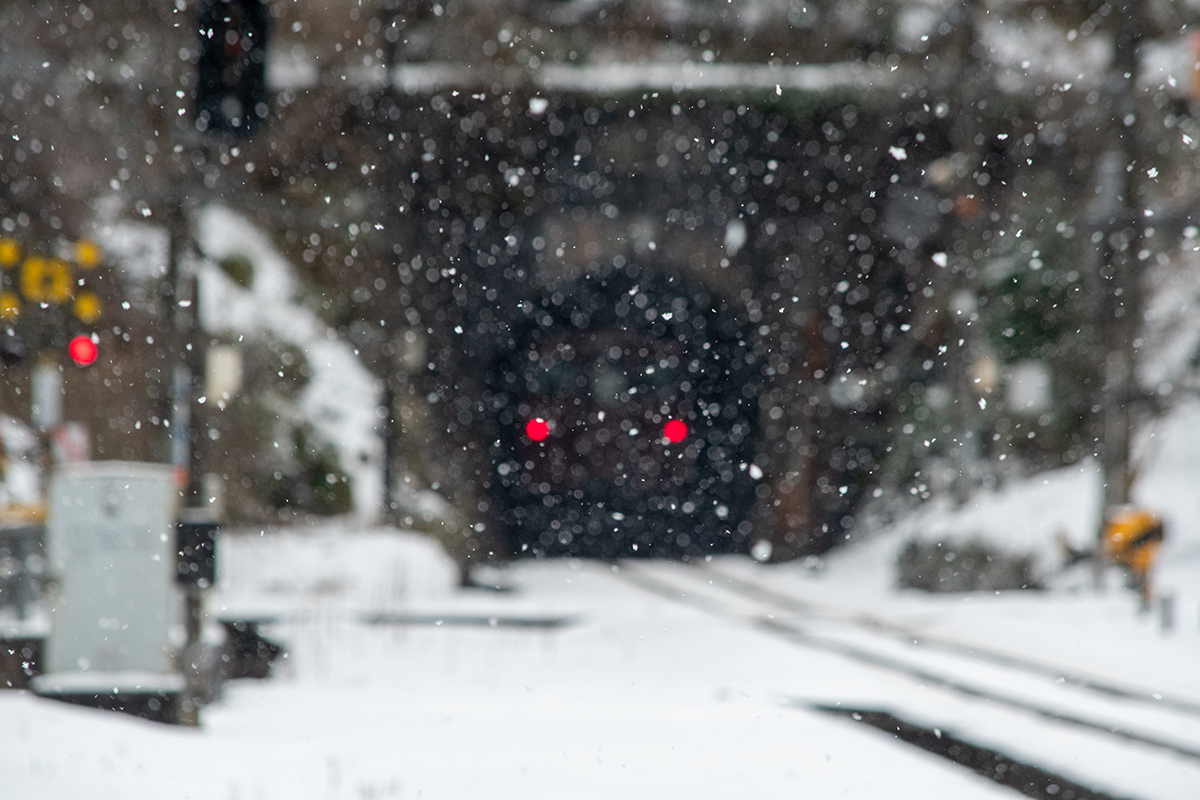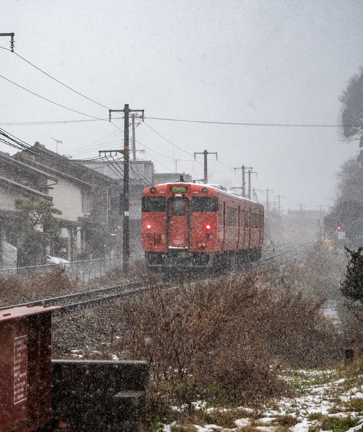 15分後には列車が来るので、急いで用意をしなければならないが、この雪で果たして写るのだろうか。それに、いつも写真を撮る傍らで動画を撮っているが、一眼レフとiPhone、それと音声は別にレコーダーで録る。この雪でセッティングできるのか。と、考えている時間はなく、こういうときのためにAmazonでかっておいたオレンジ色のポンチョを着てみる。大きなイカのようなカタチで全身を覆ってくれるのだが、これが大正解で、手持ちのカメラもダイヤや小物を入れているショルダーバッグも完全に雪から守られる。さらに、他のバッグのレインカバーをカメラ用に持ってきたのも大活躍。すべての機材をスタンバイして直前まで防雪できた。