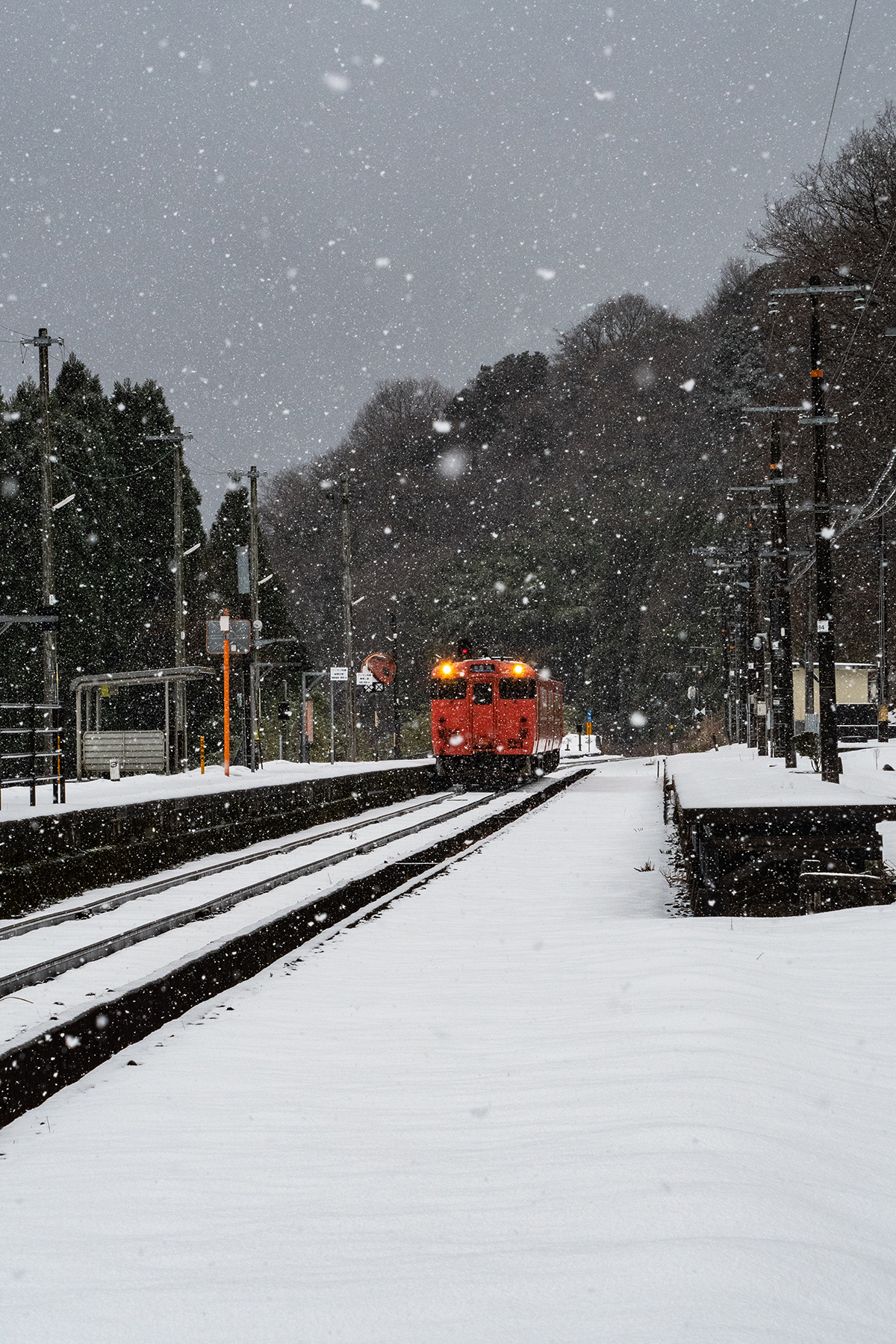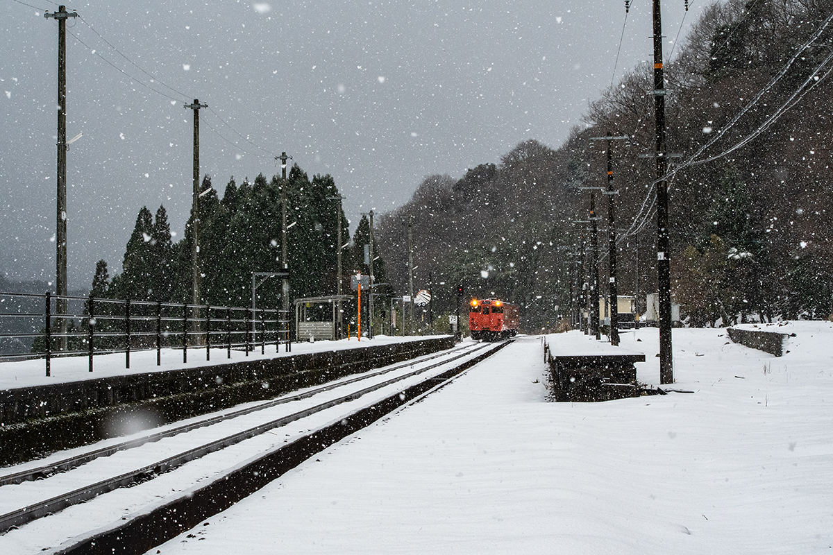山あいのぽつんとひと駅。集落から離れて、たたずむ真っ白に雪が積もったその駅は、ホーム上には、駅名表示と時刻表しかなく、待合室さえない停車場。タヌキやキツネしか乗降客はいないのではないかと思えるくらい世間から隔離された空間にしんしんと雪がふっておりました。一面が雪なので、先に抜ける道があるのかどうかも分からない。かろうじで分かる道を進んで、入るのももったいないような真っ白な空間に車を止め、しばし周囲を観察。どこからどこが地面なのかも分からないほど雪が積もっている。