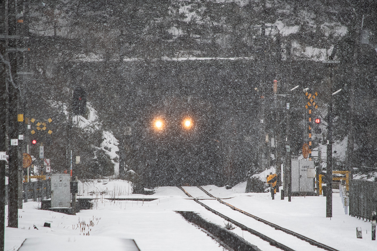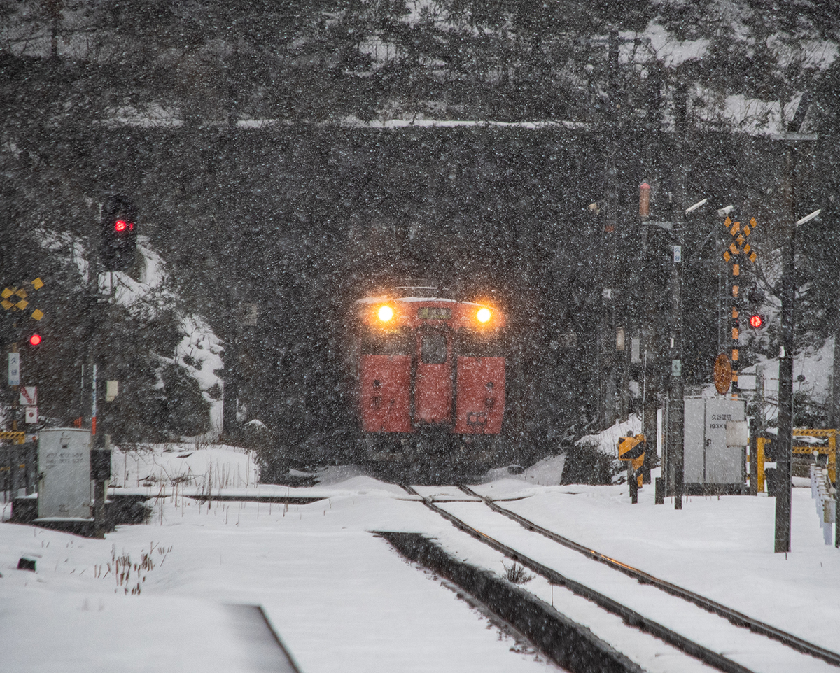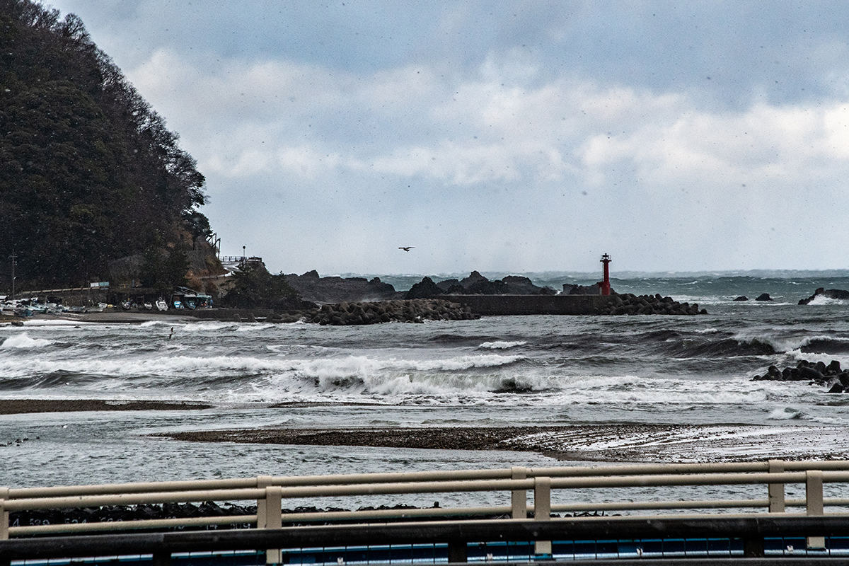 佐津は残雪すら殆どなく、あるのは以前と同じく海からの強風。ここはそういう土地なんだなと悟る。取る場所を探しているウチに1本見逃しの三振(T-T)やっと場所を確定したら、今度は鬼のような吹雪に。もう撮影どころではない。クルマの外にも出られない。ホントに厳しい気候だなあと、山陰海岸の風雪を知るのだった。