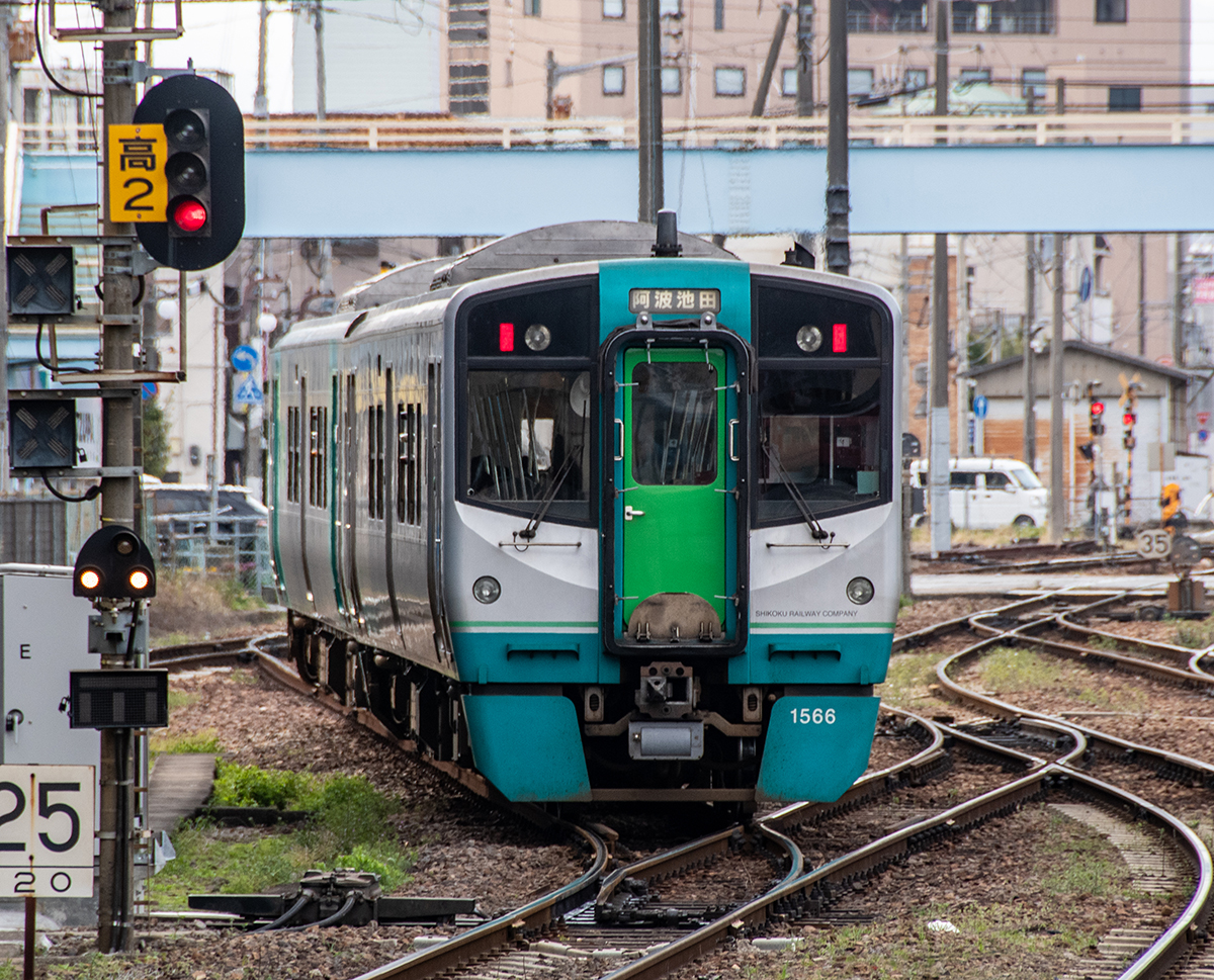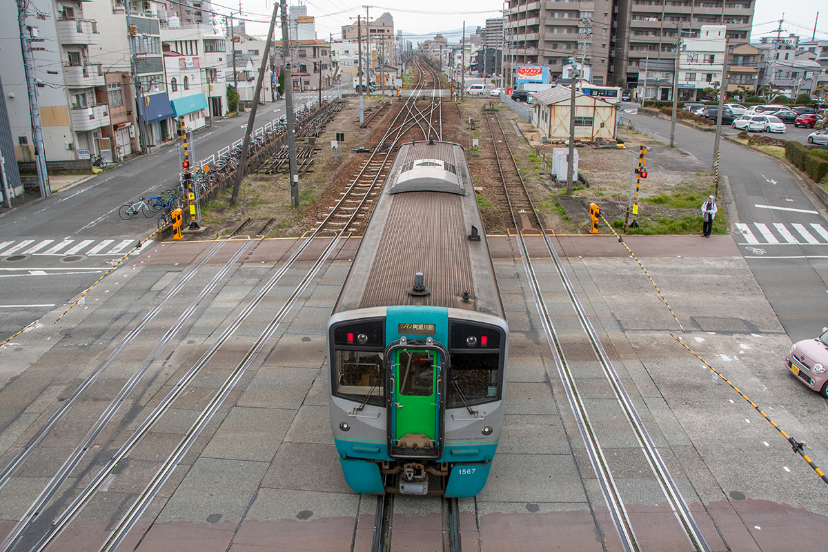 徳島駅の外れに陸橋があり、そこから駅のヤードが良く見えた。関西だとこういう陸橋も高い柵や網が張ってあって見えにくが、ここは柵は低くて良く見える。ローカル線的とは言えやはり県庁所在地の徳島、3つの路線の起点で頻繁に列車が行き来する。駅のヤードにはディーゼルカーがズラ〜っと並ぶ。SL時代の転車台もまだ使われているようだった。